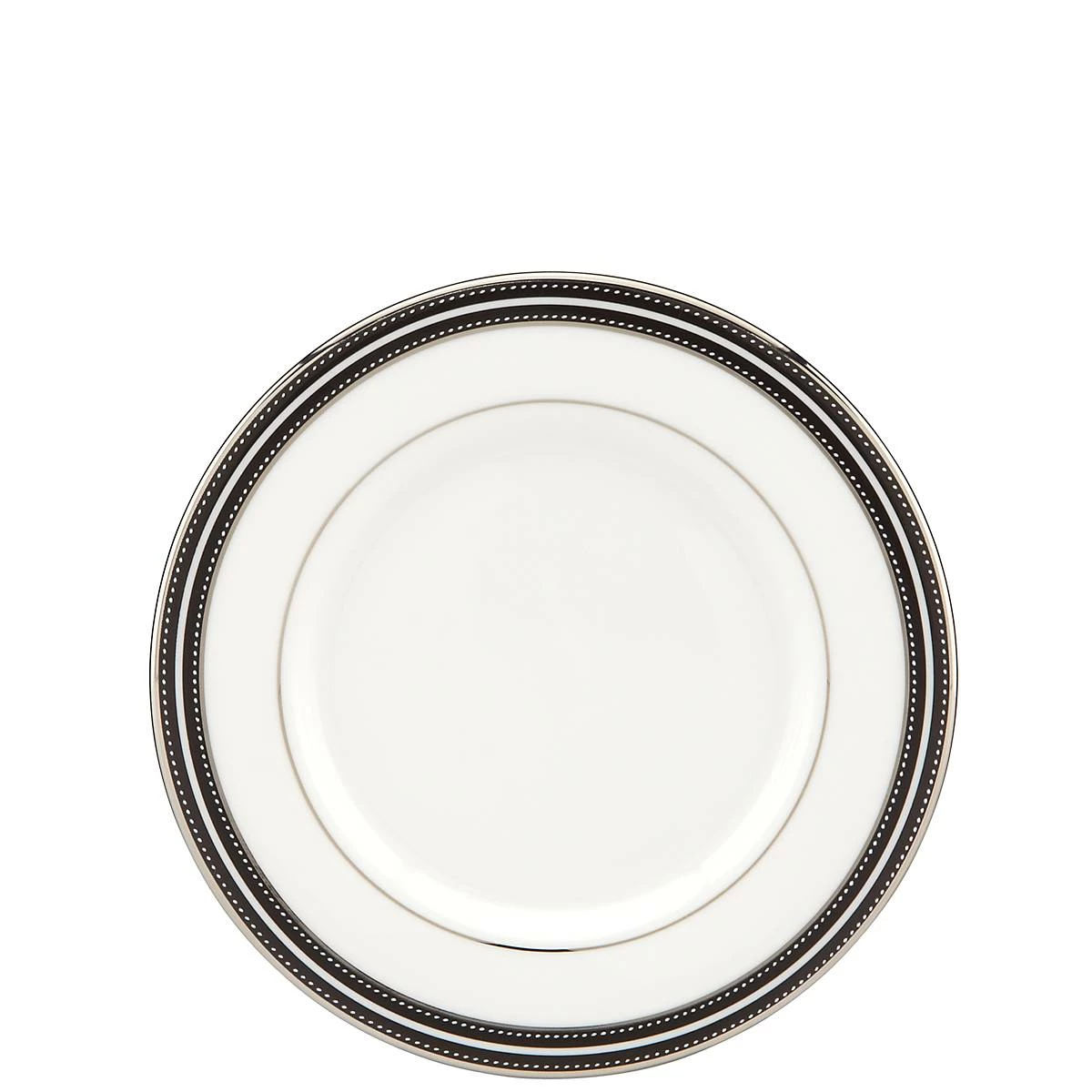 White raised “stitches” with black banding and platinum details give the kate spade new york Union Street Saucer a sophisticated look. This is chic bone china dinnerware, perfect for any occasion.