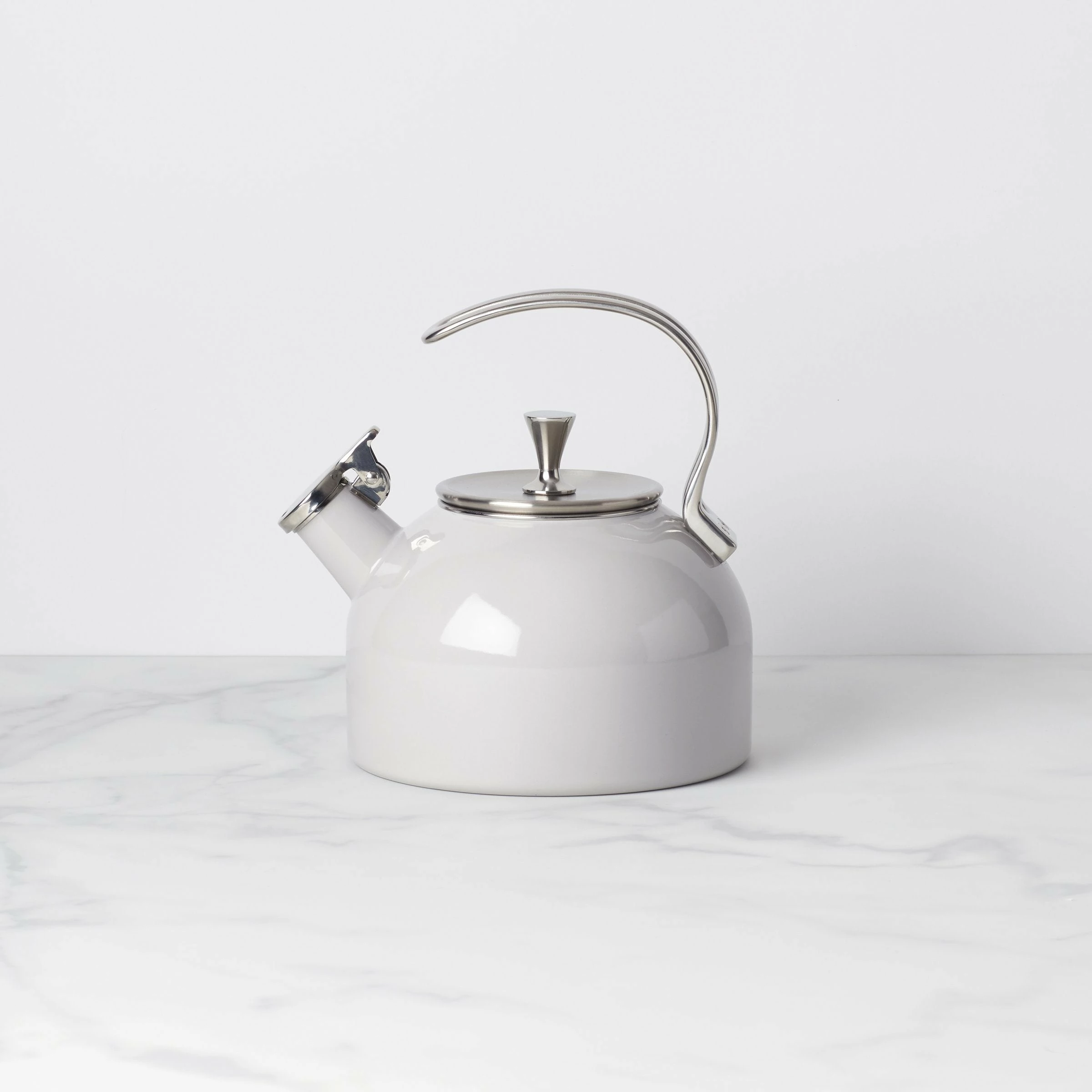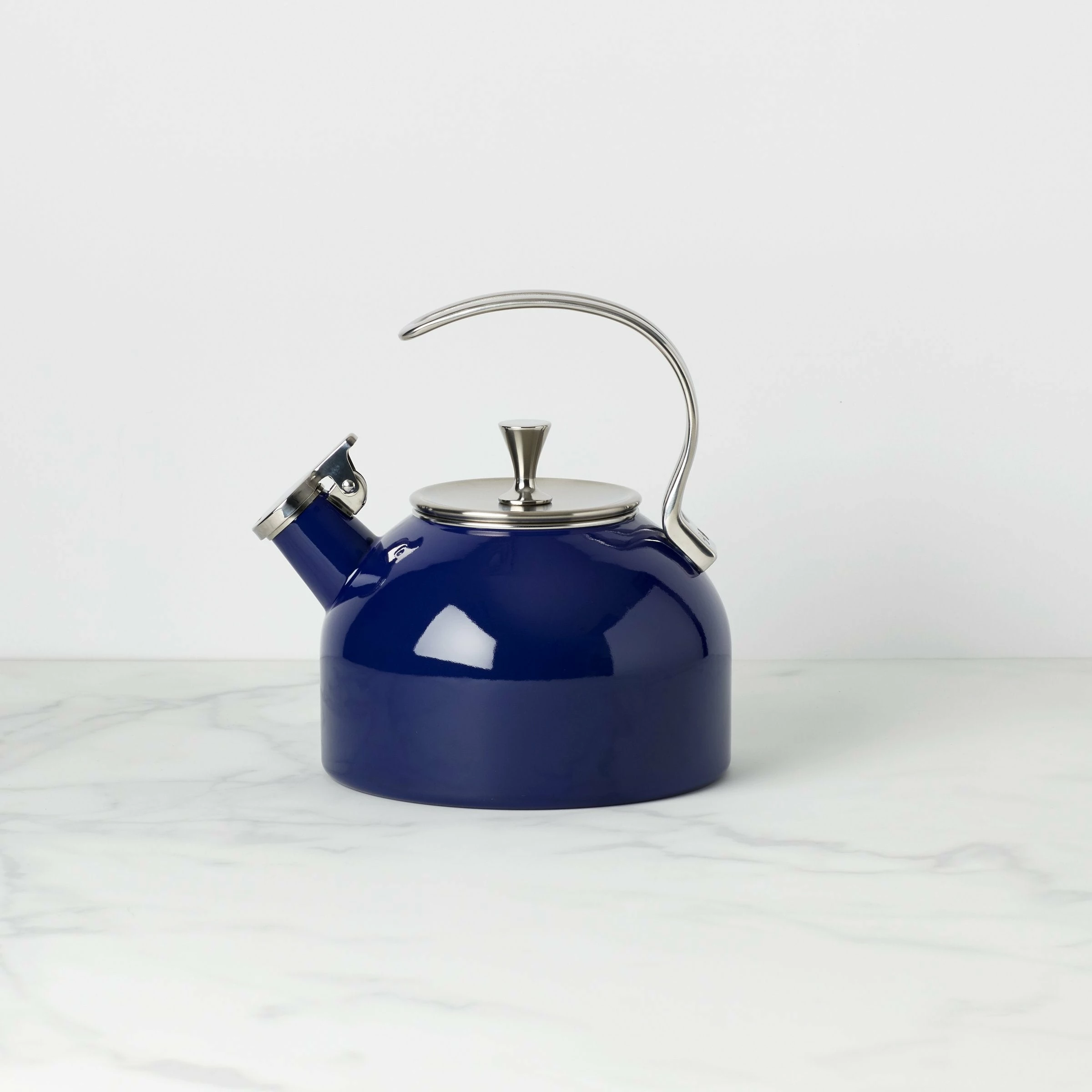 Sip and serve in style with this sleek tea kettle from Kate Spade New York. The polished enamel surface delivers a healthy dose of classic charm that you love. The bonus? It features a cute little “Whistle While You Work” message at the spout for a bit of cheeky fun.