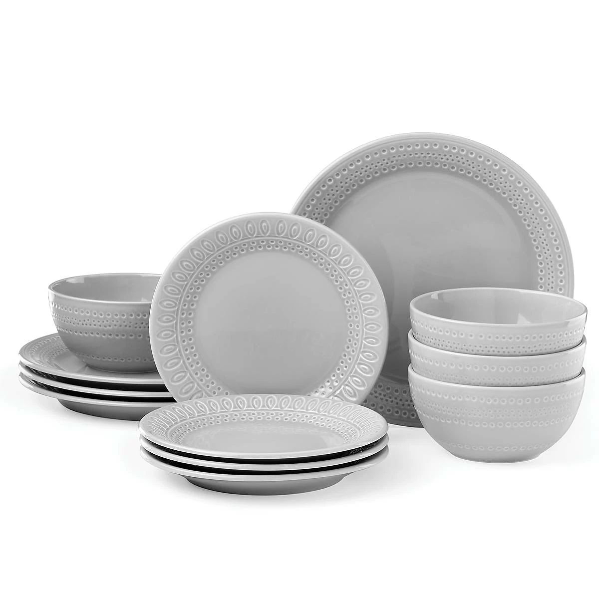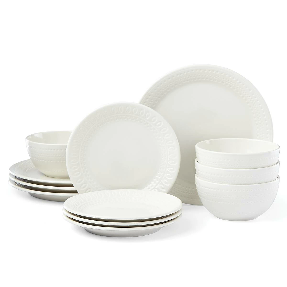 Made from glazed stoneware, the Kate Spade New York Willow Drive Collection is defined by its pretty, eyelet-inspired detail and sets the scene for any meal–whether it’s a homemade, multi-course masterpiece or takeout. The Willow Drive Grey 12-piece Dinnerware Set is microwave and dishwasher-safe.
