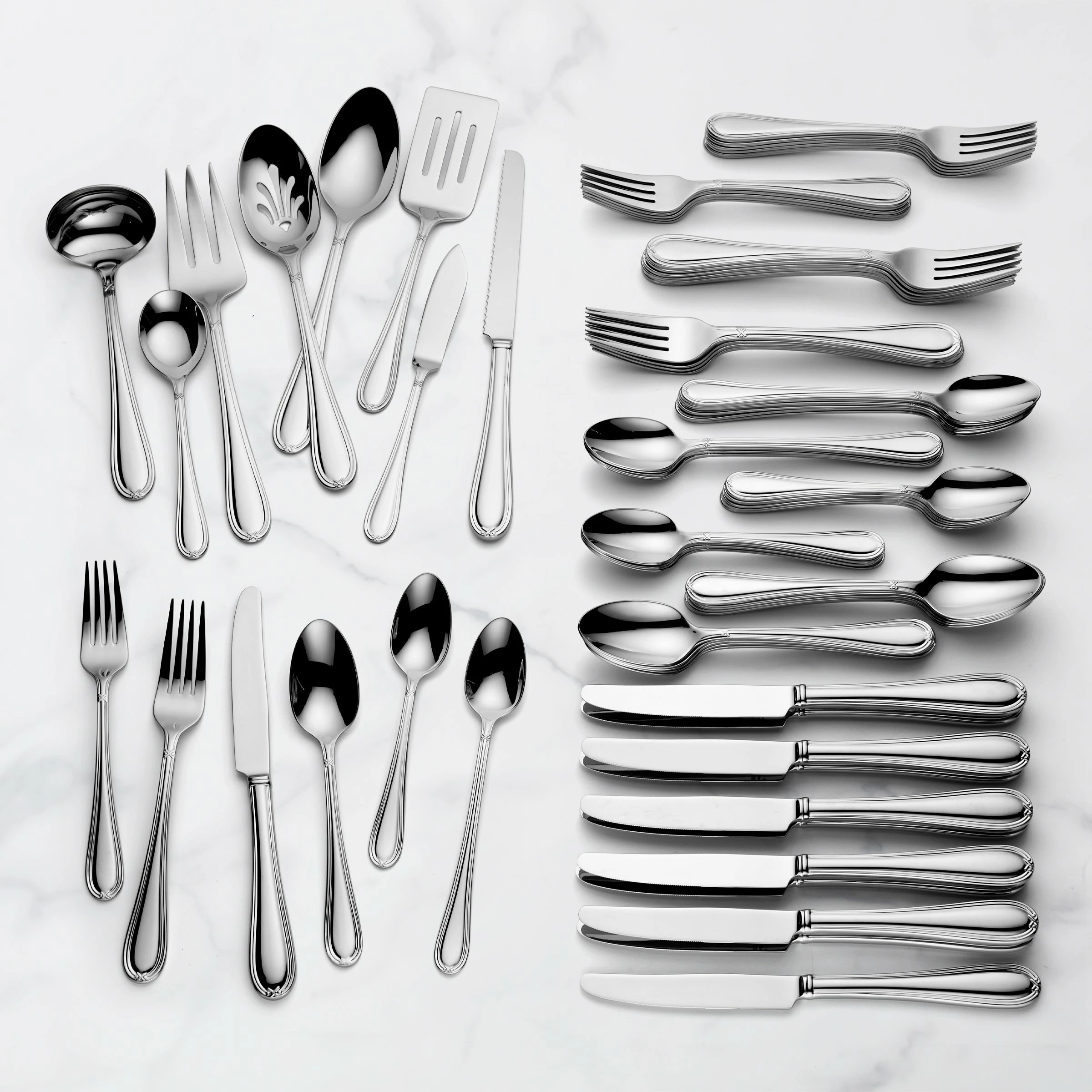A stunning presentation fit for everyday use! Sleek double bands are capped off with an X knot at the neck and base on this polished, Ashbridge flatware set. Crafted of rust-resistant 18/10 stainless steel, it’s a strong and durable set that’s guaranteed to last you a lifetime. Perfect for serving twelve people (or building out your utensil drawer), it comes with 12 five-piece place settings (12 dinner forks, 12 salad forks, 12 teaspoons, 12 dinner spoons and 12 knives), 12 iced beverage spoons, 1 ladle, 1 sugar spoon, 1 serving fork, 1 pierced serving spoon, 1 serving spoon, 1 dessert server, 1 butter serving knife and 1 bread knife.