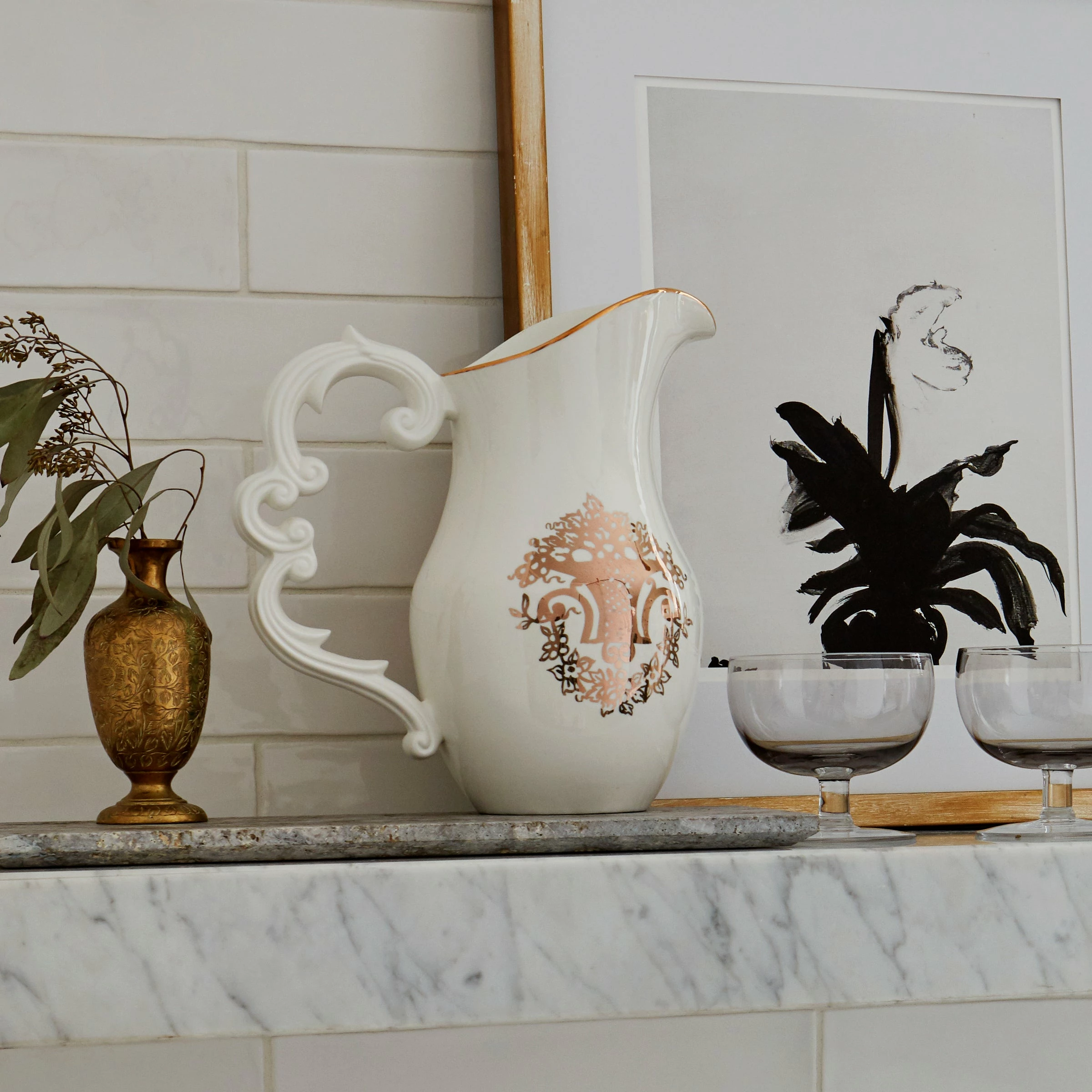 Luxe in glossy white porcelain, this tall pitcher is an inspired revival of our 1918 Autumn collection with its shimmering update of the iconic cornucopia pattern. It’s designed as a modern retelling of our past that also serves an elegant refresh to your home. Rich in sumptuous curves, ornate handlework and a golden trim at the opening, this pitcher makes a gorgeous statement piece for your mantel.