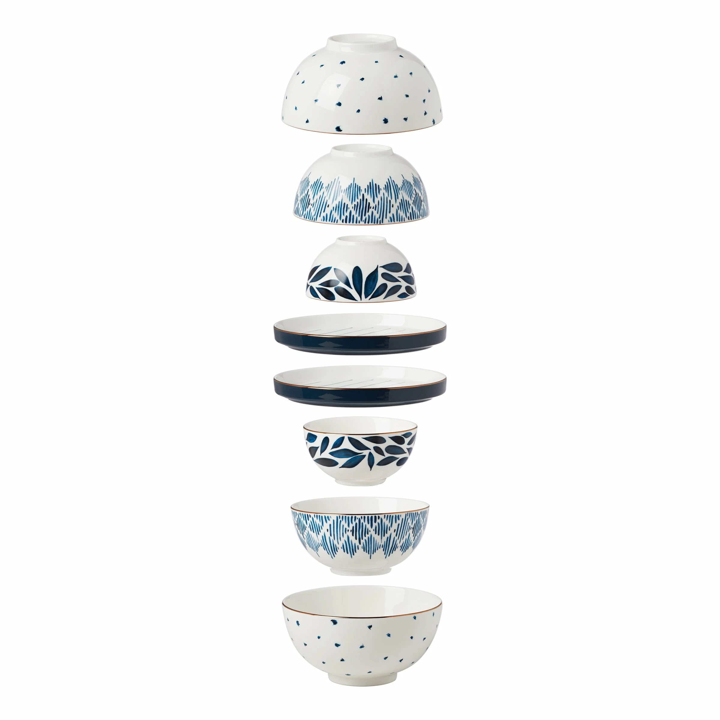 Everyone’s favorite nesting dinnerware set is now available in our Blue Bay collection. Featuring patterns of dots, stripes, ikats, and leaves with a rich blue color, this set stows six bowls and two plates inside. Take it apart to use or keep it together for a statement piece!