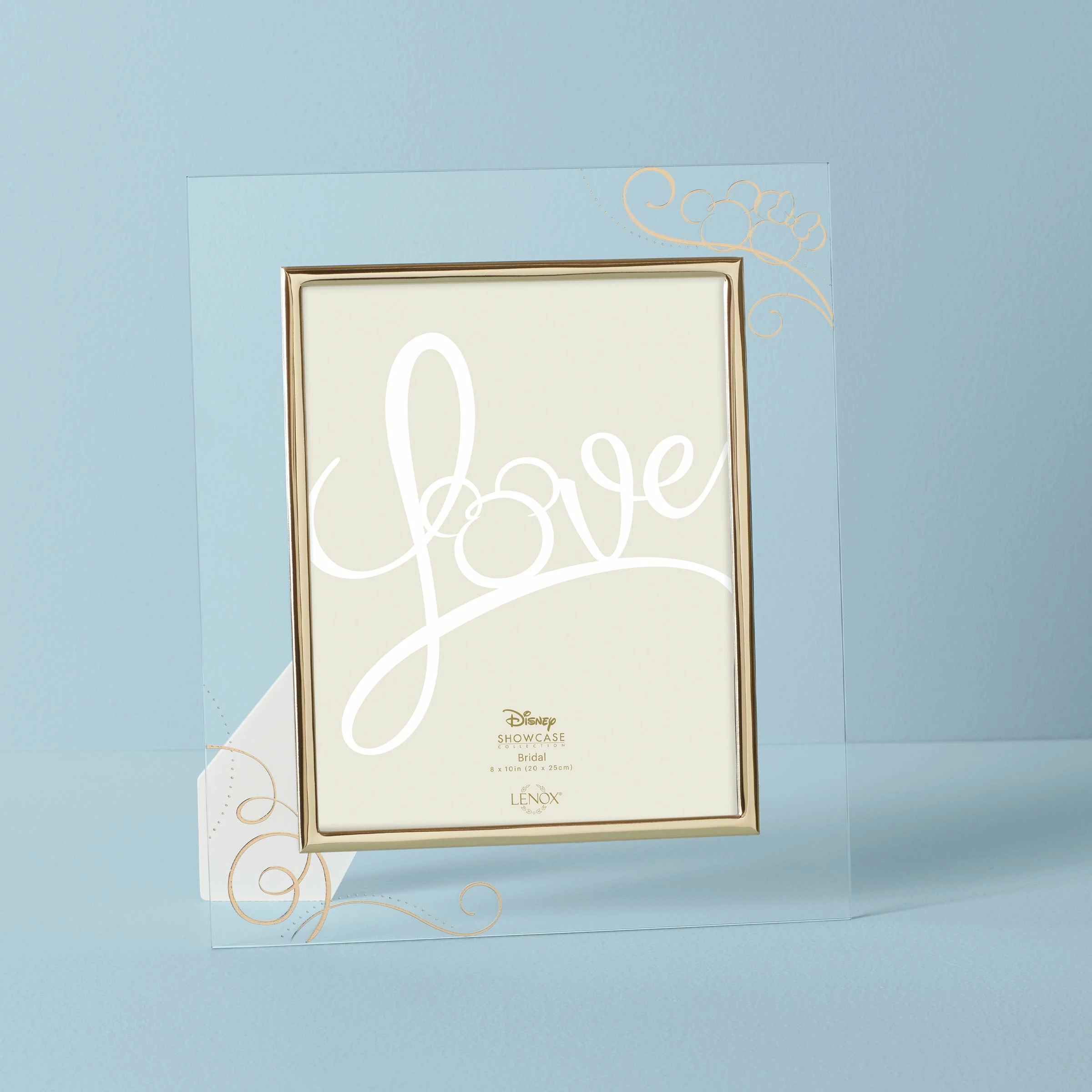 Celebrate the magic of love with this precious Disney frame that has Mickey and Minnie swirled into the design. Crafted of glass and finished with a 24k gold decal, this frame is perfect for the couple who just celebrated a wedding, engagement or anniversary.