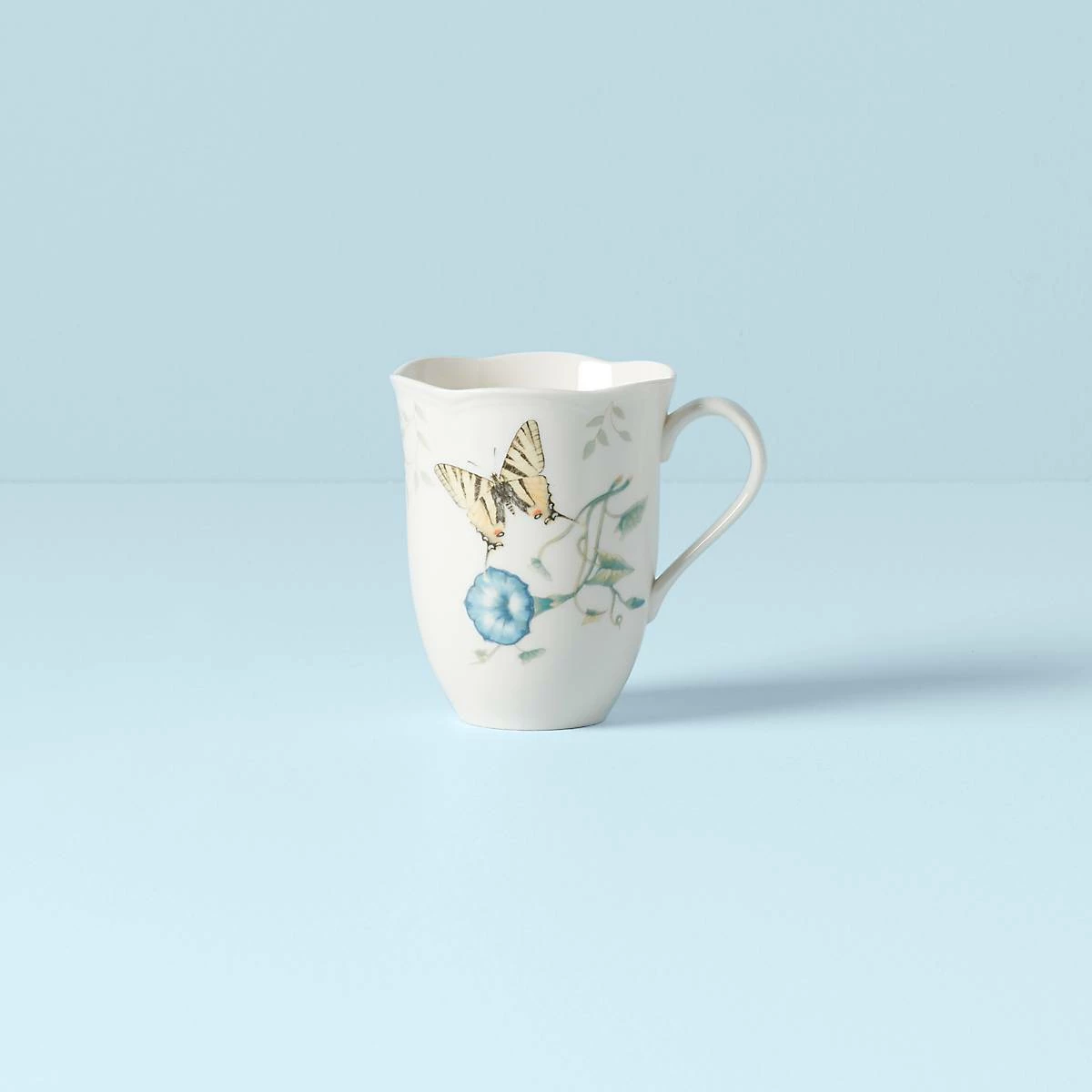 Lively blossoms tempt colorful butterflies amidst motifs of light-palate foliage. Crafted from durable ceramic porcelain with scalloped edges and a petite handle, the Butterfly Meadow Tiger Swallowtail Mug is dishwasher and microwave-safe for a charming and functional kitchen addition.