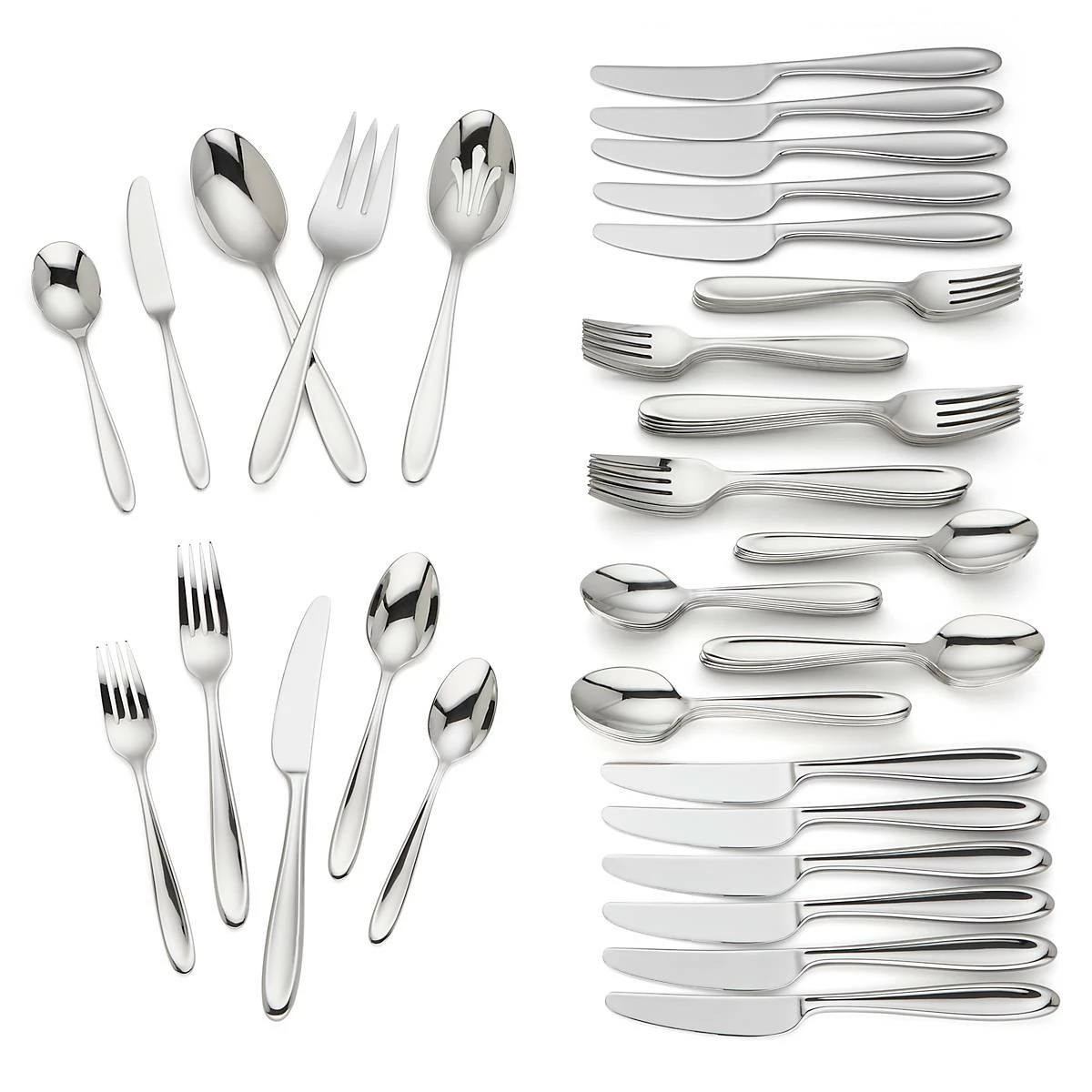 The regal and pristine Cantera 65-piece Flatware Set is crafted of durable 18/10 stainless steel. This elaborate and dishwasher-safe silverware set includes twelve dinner forks, salad forks, dinner knives, tablespoons, and teaspoons, in addition to a serving spoon, pierced serving spoon, sugar spoon, butter knife, and serving fork.