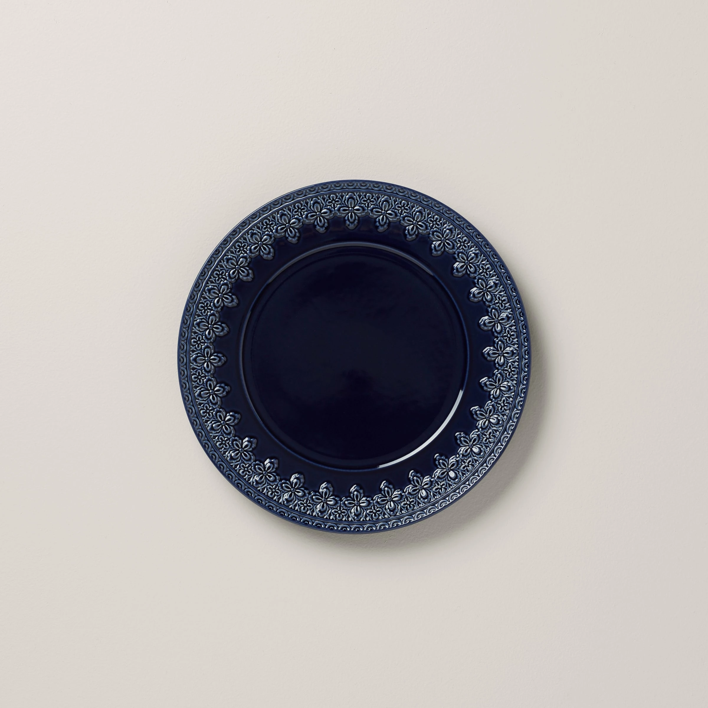 Reminiscent of French matelassé technique, the Chelse Muse Fleur Navy Dinner Plate boasts an intricate quatrefoil pattern carved around its edge with a reactive glaze. This rich navy ironstone dinnerware is dishwasher and microwave-safe.