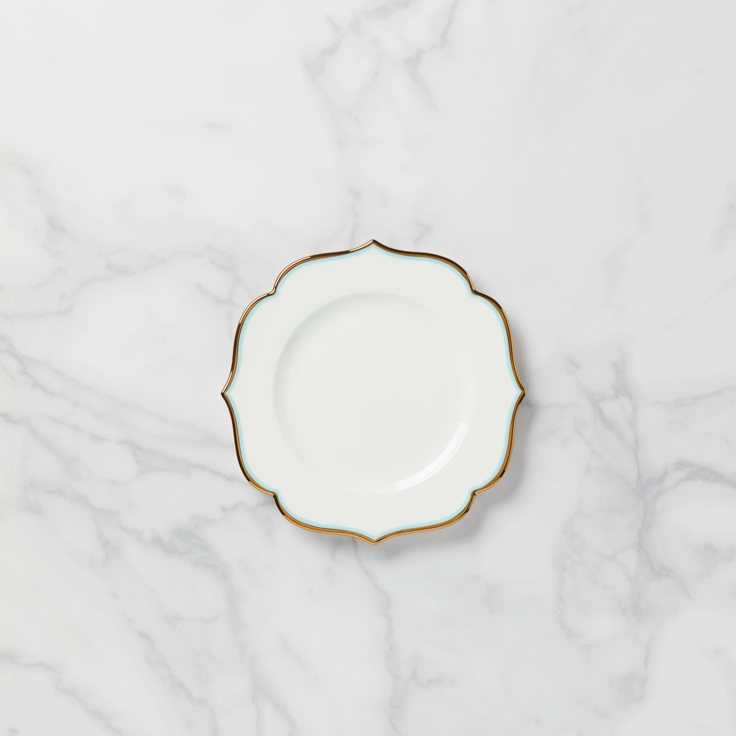 Crafted of durable bone china, the Contempo Luxe Sapphire Accent Plate is ideal for side salads or sandwiches. This plate features an enchanting blue color profile, with innovative microwave-safe gold accents encompassing its scalloped rim. This dishwasher-safe plate functions well with formal and casual dinnerware.