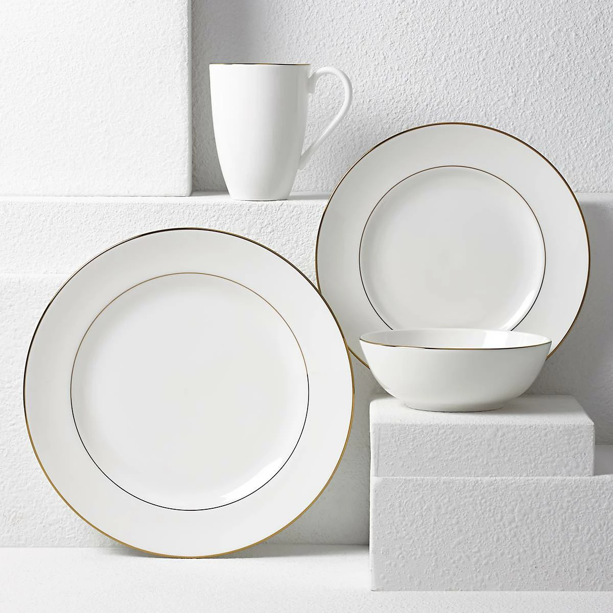 The Continental Dining Gold 4-piece Place Setting boasts a revolutionary microwave-safe gold trim around its edges. Crafted from durable bone china, this dishwasher and microwave-safe dinnerware set is excellent for formal and everyday occasions.