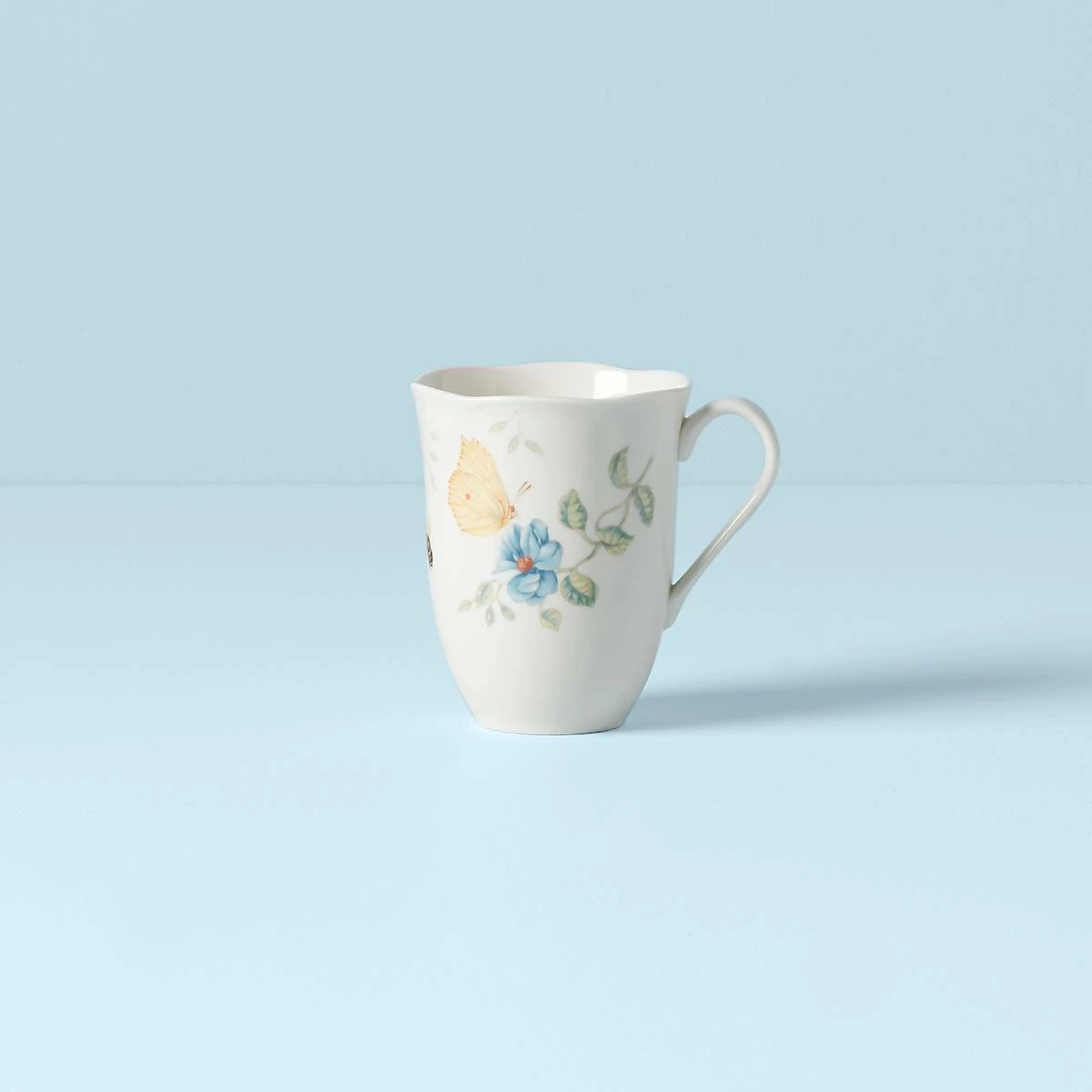 A dragonfly flutters above a welcoming flower on the charming Butterfly Meadow Dragonfly Mug. This durable white ceramic porcelain mug features a scalloped rim, and is microwave and dishwasher-safe. Mix and match the mug with other Butterfly Meadow mugs, saucers, and dinnerware.