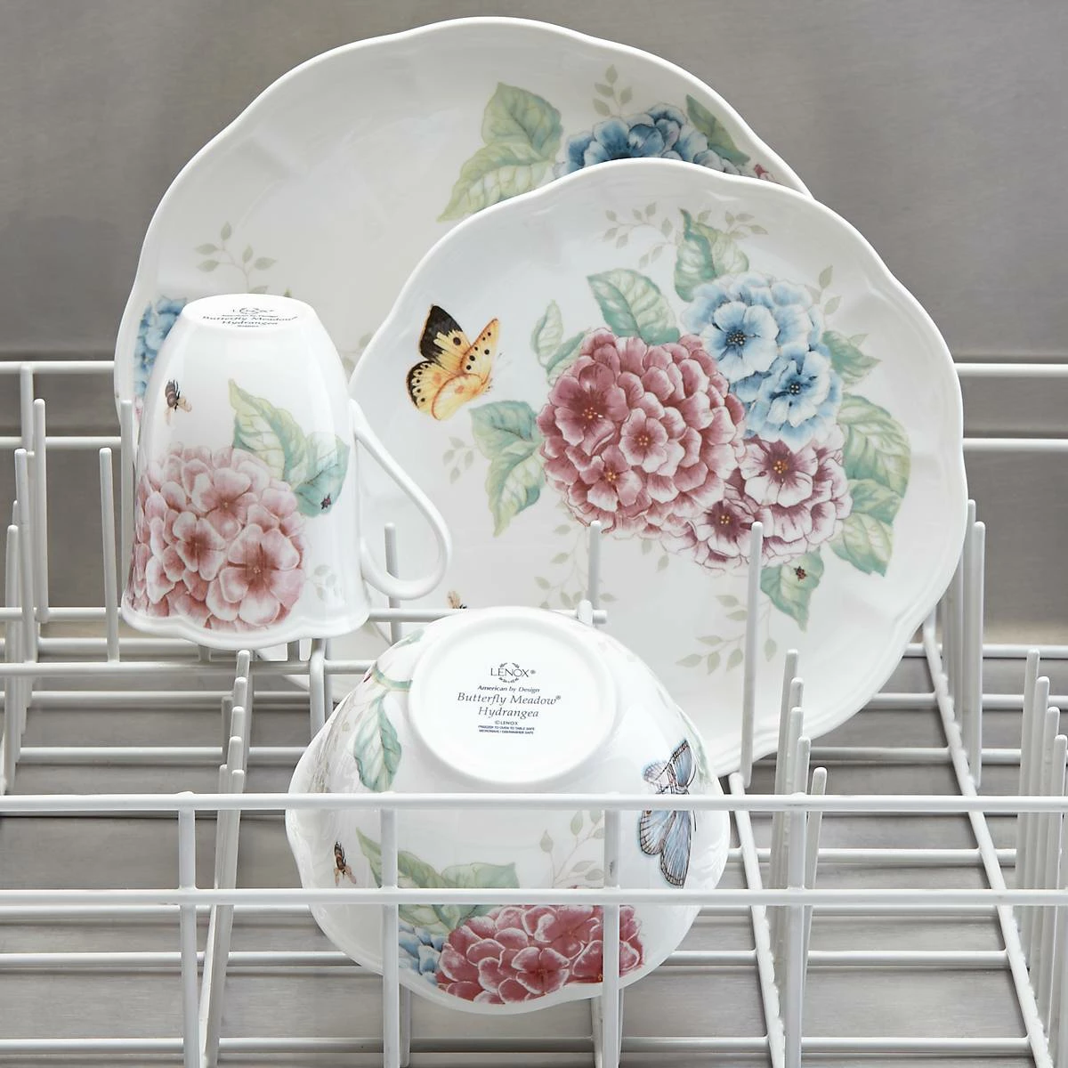Richly detailed hydrangea lend blooming color to the trademark Butterfly Meadow pattern, aflutter with butterflies, dragonflies, and bumblebees. Mix and match with classic Butterfly Meadow items for a lovely, lively table setting you’ll adore.