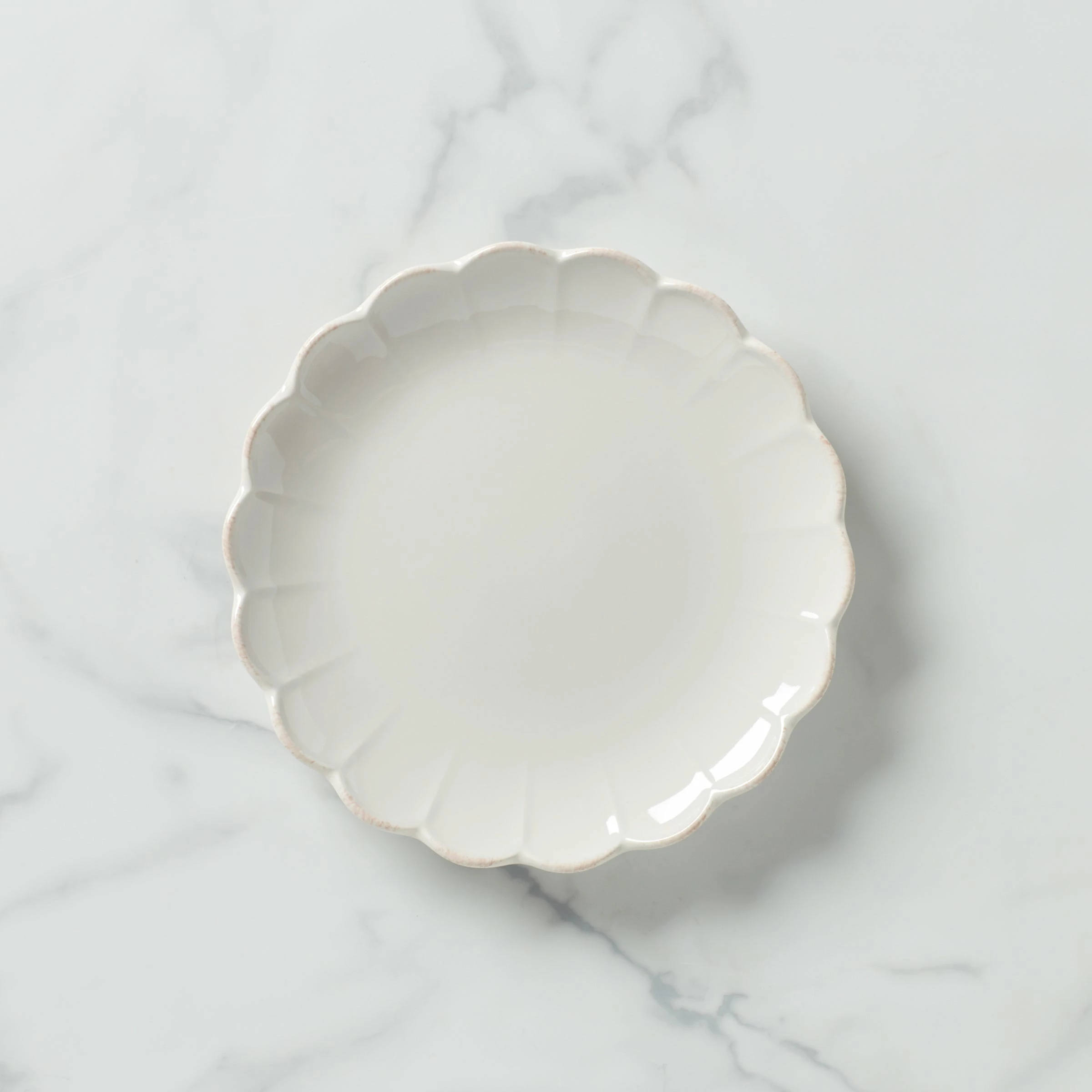 Introducing a fresh and feminine new design to celebrate the 10 year anniversary of French Perle! This accent plate is a twist on the classic country look with its clean, elegant motif, beautiful ruffles and tea-stained finish. For distinct cafe charm, mix French Perle Scallop with any of our other coordinating collections, like Classic, Groove and Bead. Bon appetit!