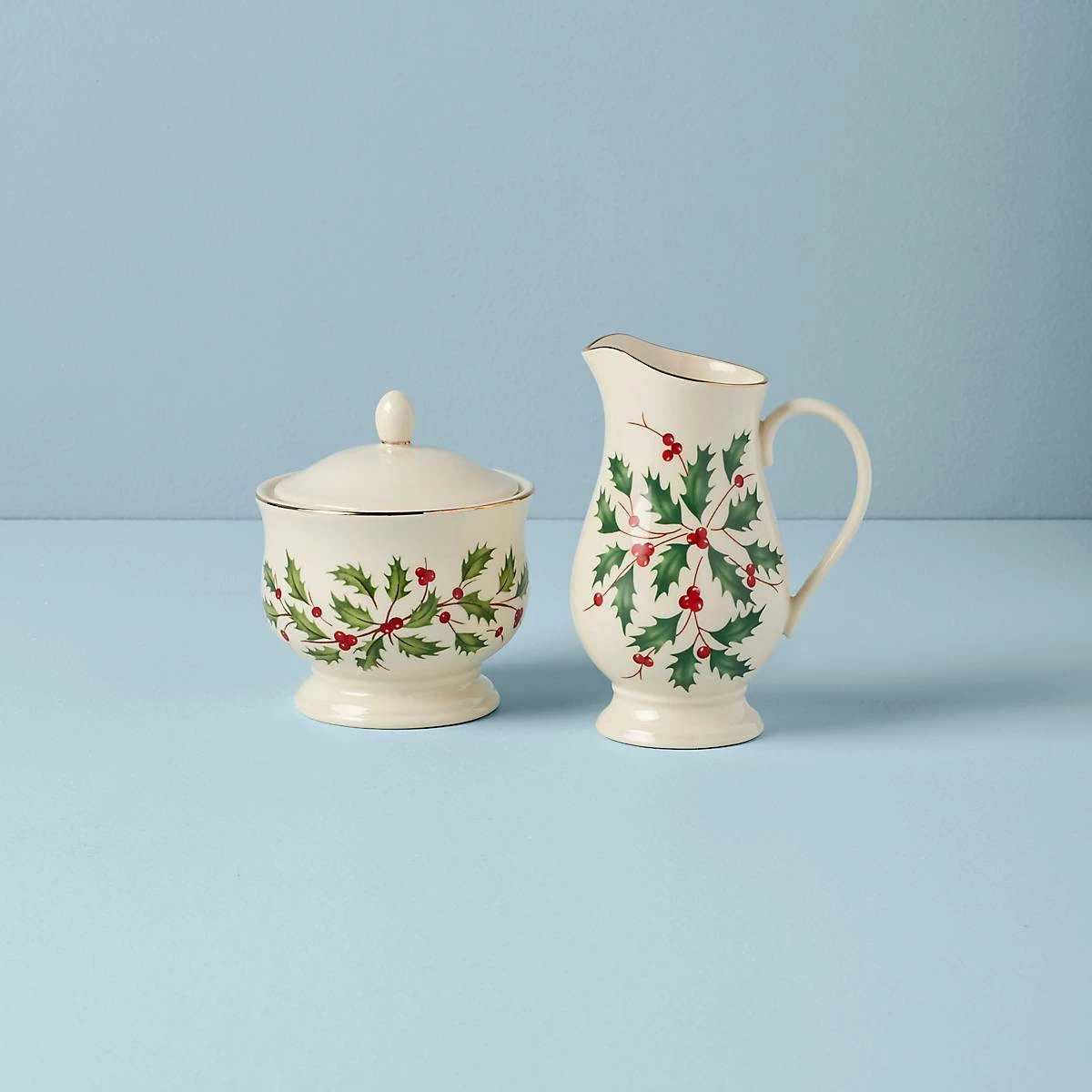 This matching sugar bowl and creamer set is perfect for serving after-dinner coffee or tea with your holiday meals. Crafted in ceramic with 24-karat gold accents, this set features Lenox’s iconic holly leaves and berries motif.