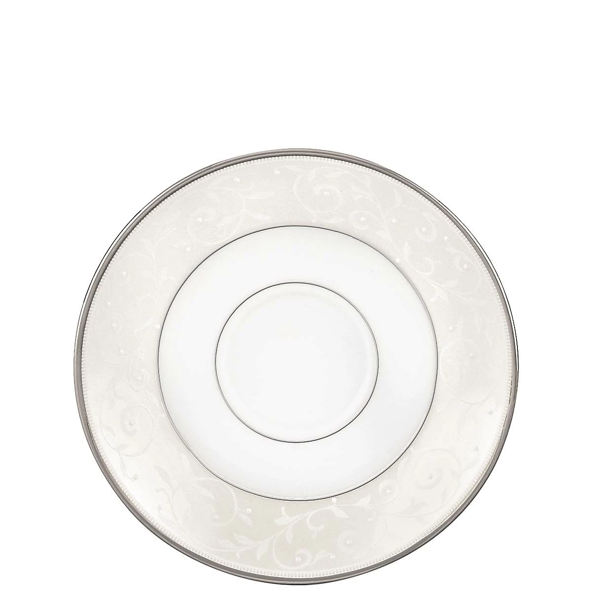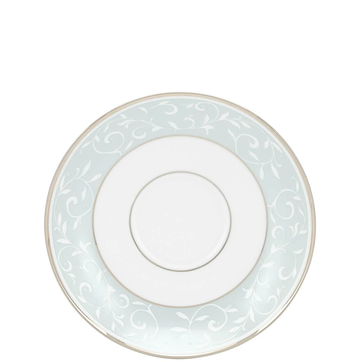 Ideal for an upscale and lavish tea time, rest a teacup on the elegant and serene Opal Innocence Blue Saucer. This dishwasher-safe, durable bone china saucer features a soft blue motif of scrolling dots, and is accented in precious platinum.