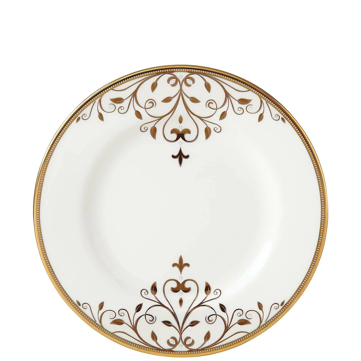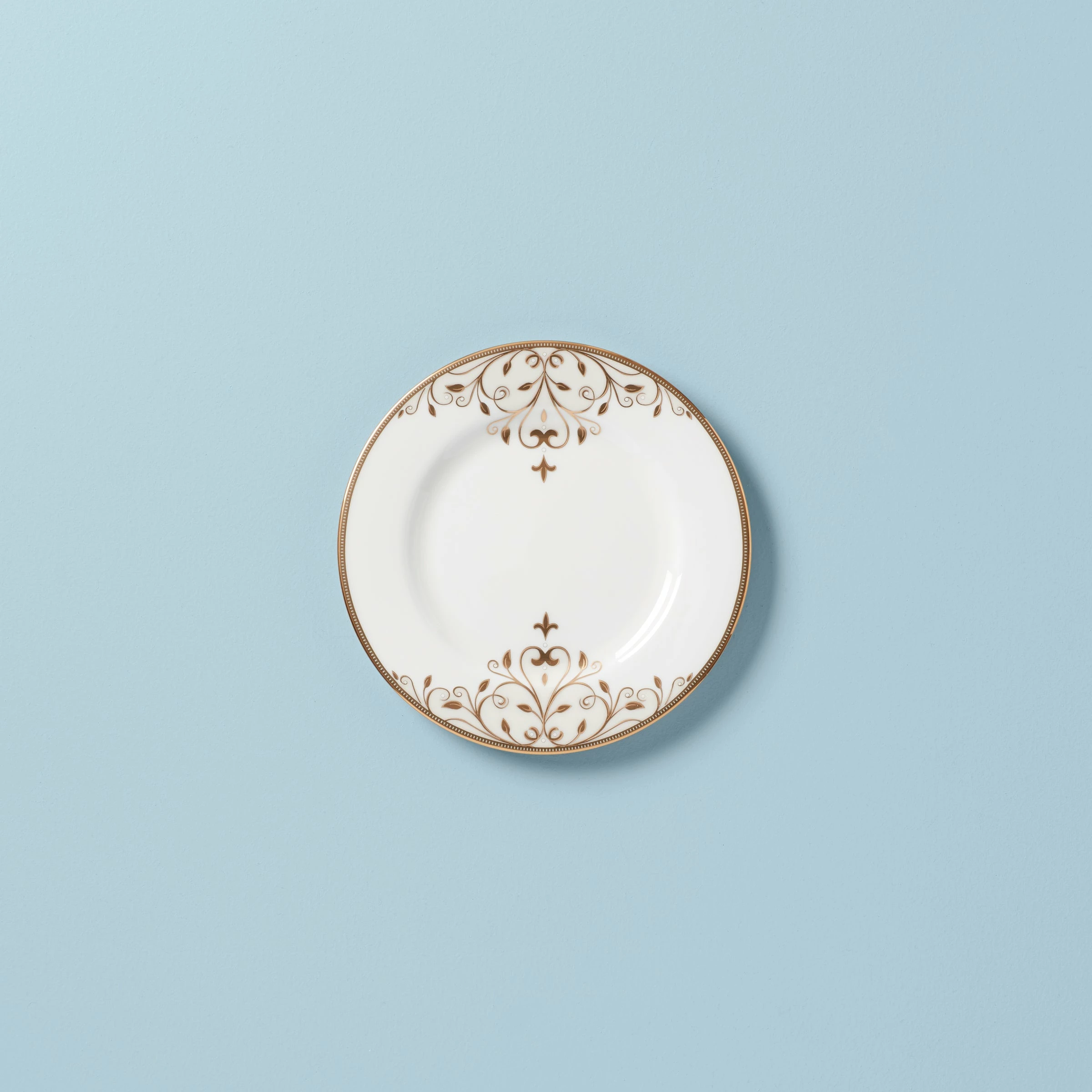 The ornate and stylish Opal Innocence Scroll Gold 8″ Salad Plate features a shimmering white mica scroll motif. This elegant and durable bone china salad plate is accented in precious 24-karat gold, and is dishwasher-safe for added convenience.
