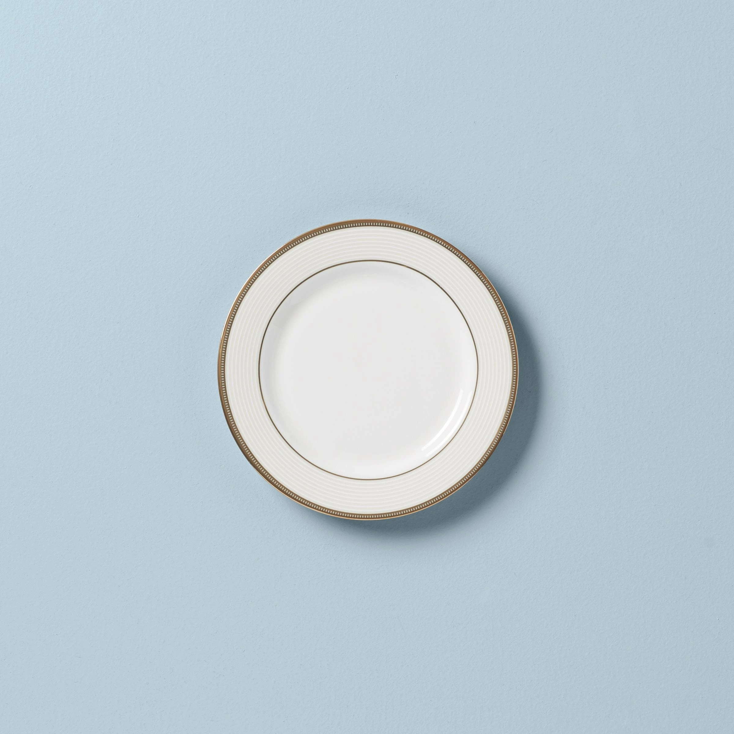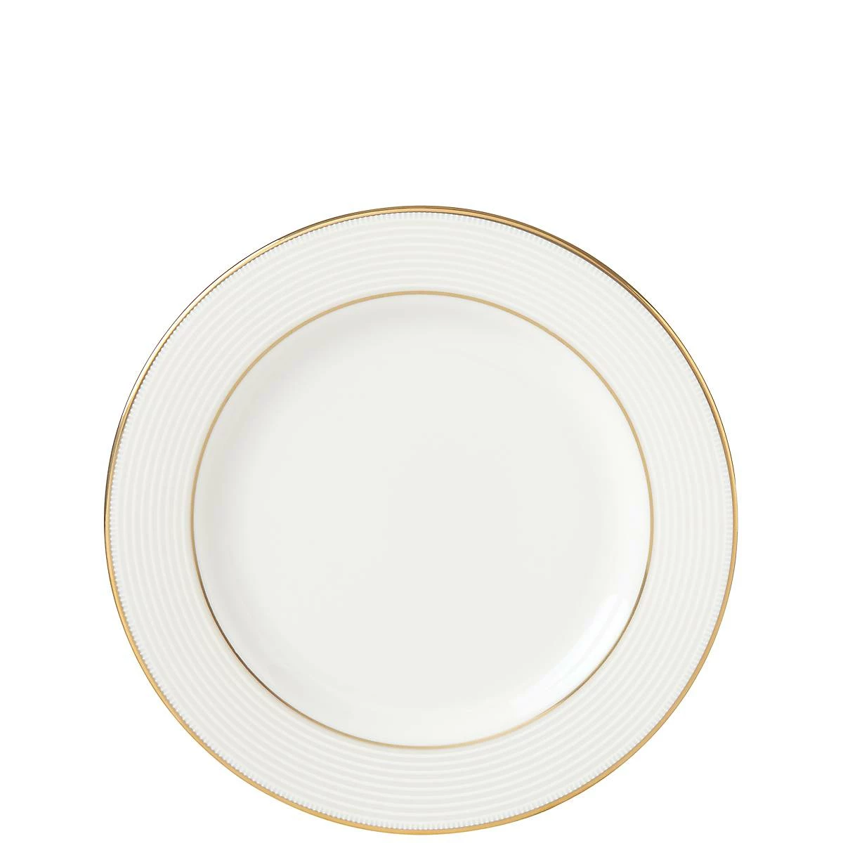 Elegant and classic, the Opal Innocence Stripe Gold Bread Plate is framed by a collection of pristine raised white stripes inside two concentric circles of precious 24-karat gold accenting. This ornate and durable bone china plate has a subtle texture, and is dishwasher safe for added convenience.