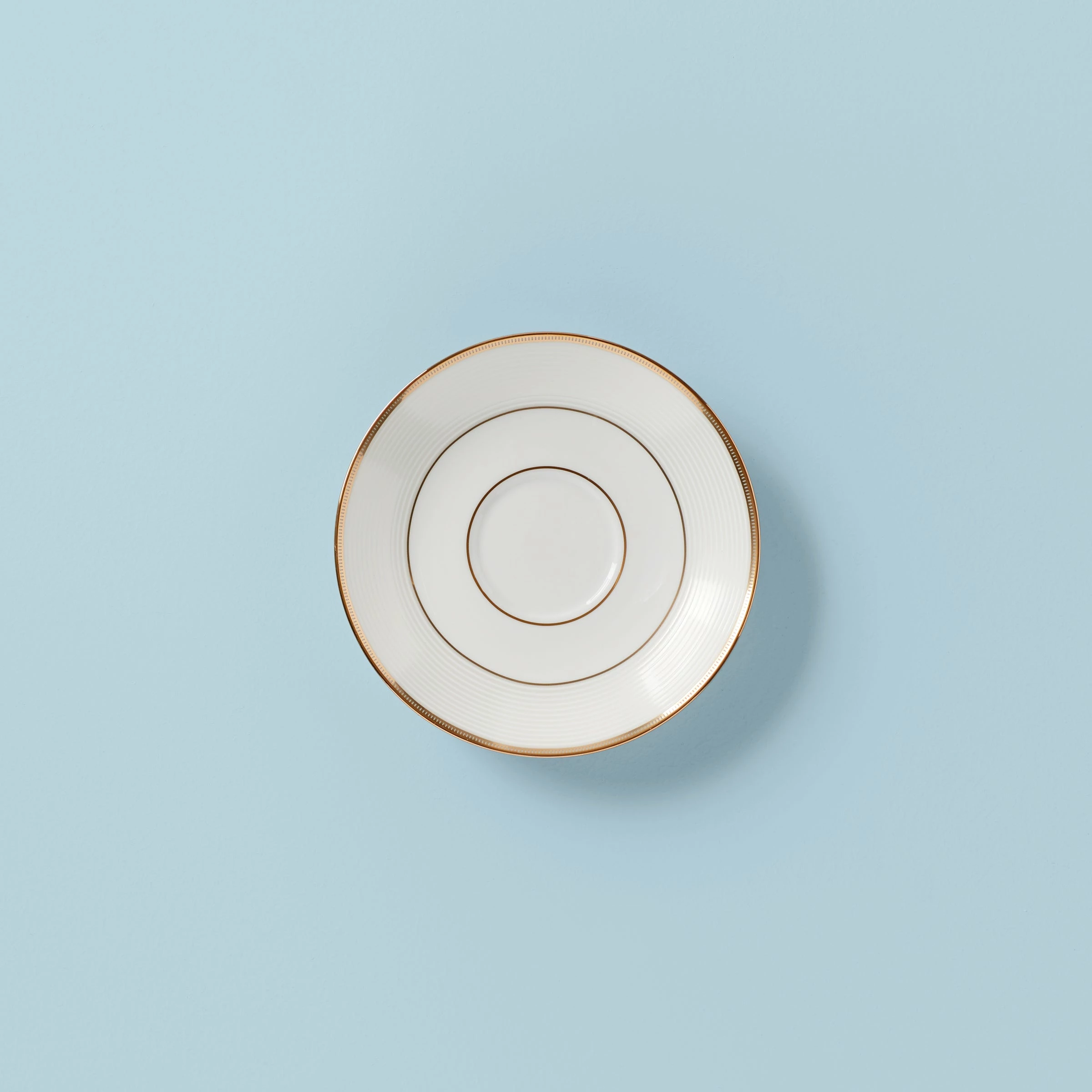 Ideal for an upscale coffee or tea time, rest a teacup on the classically elegant Opal Innocence Stripe Gold Saucer, which features a textured motif of raised white stripes. This ornate and durable bone china saucer is thoroughly accented in precious 24-karat gold, and is dishwasher-safe for added convenience.