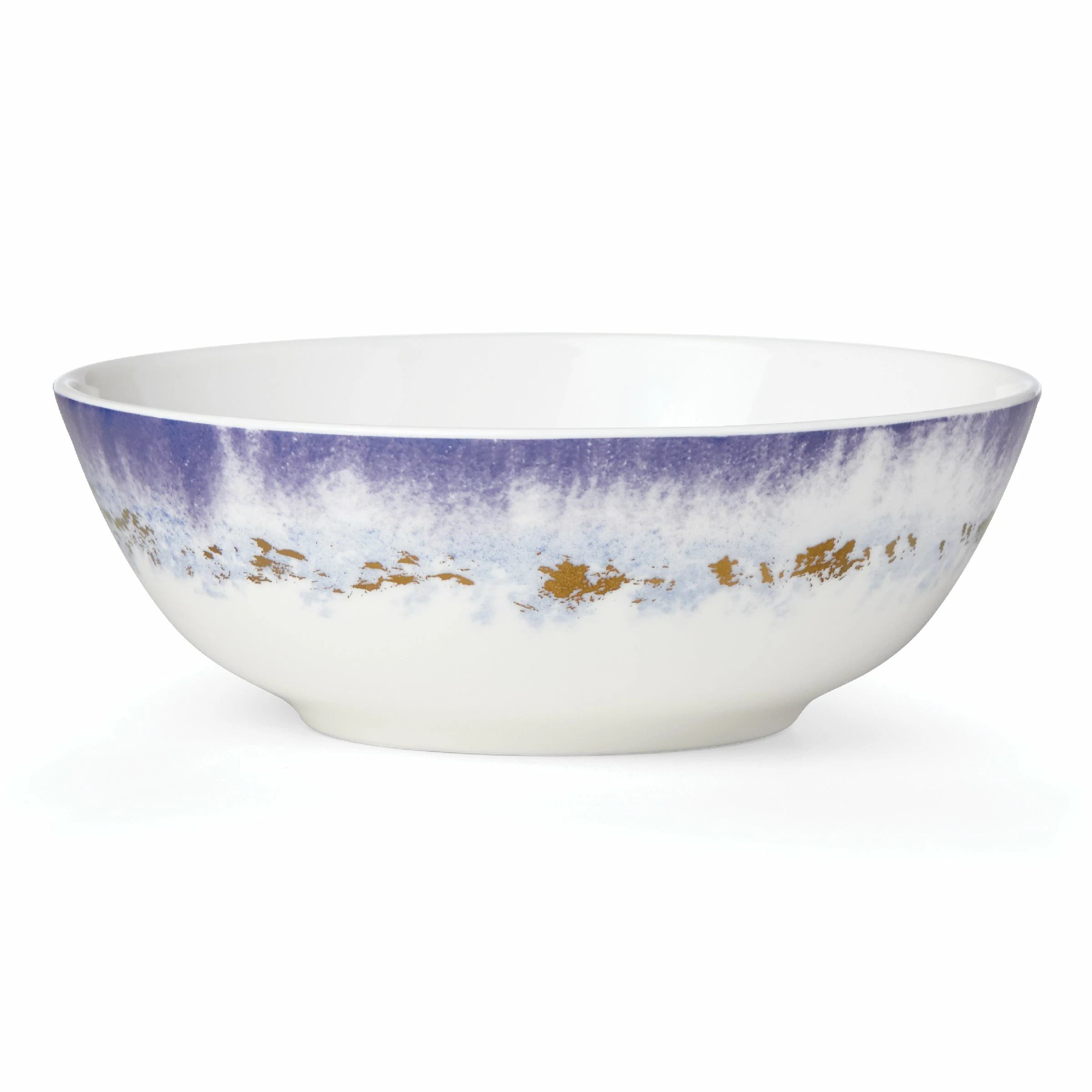 A bold and vibrant motif of blue-gold brush strokes and spatter decorate the colorful Watercolor Horizons Amethyst All-Purpose Bowl. This warm and durable bone china bowl is crafted with microwave-safe gold, and is microwave and dishwasher-safe.