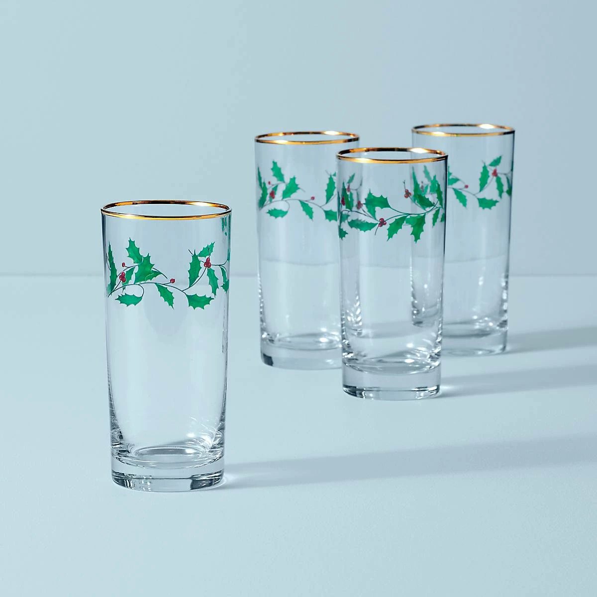 Wreaths of holly leaves and berries circle this distinctive set of highball glasses. An elegant band of 24-karat gold accents the rims of these festive and ornate holiday glasses.