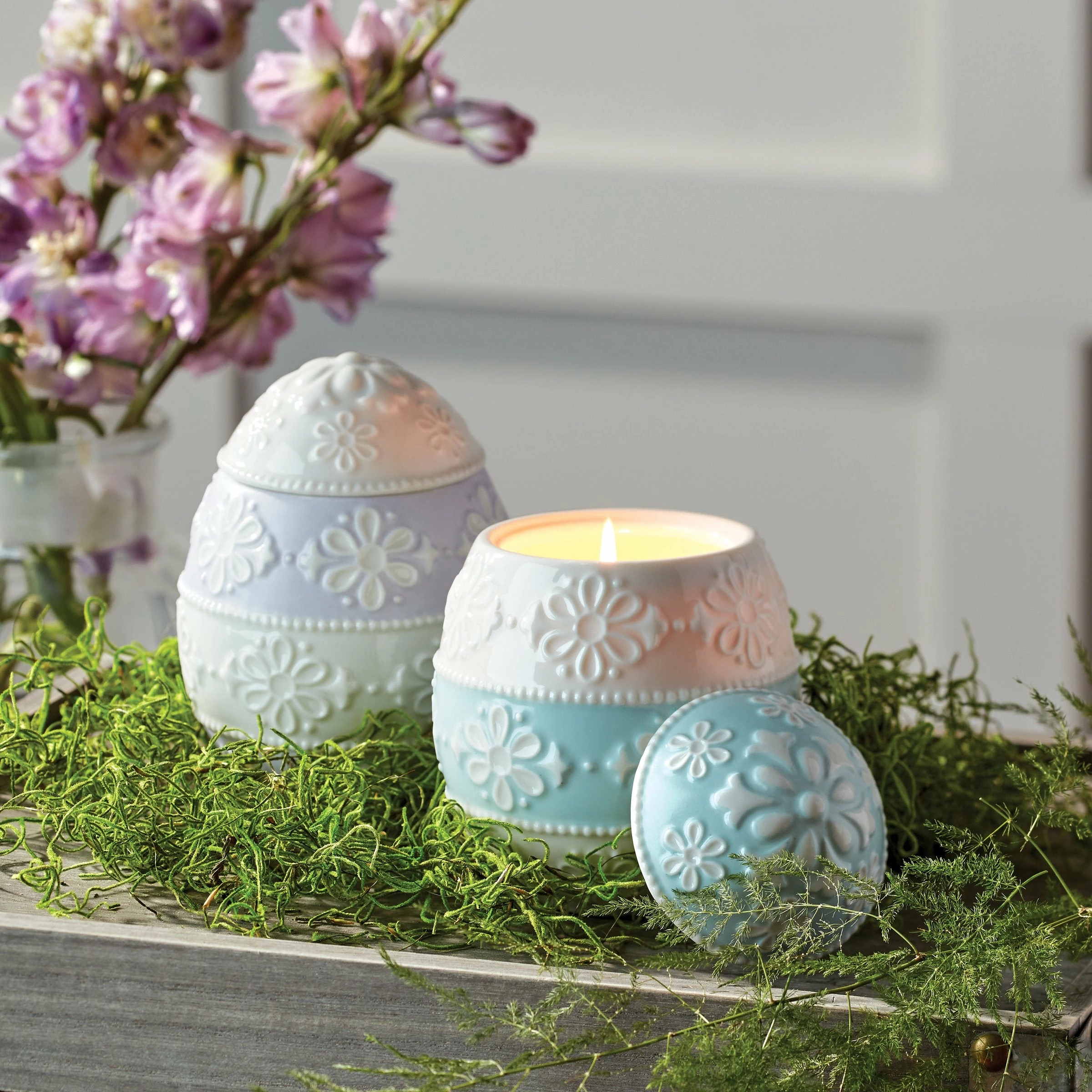 This delightful Easter Eyelet collection is inspired by the eyelet patterns of spring fashion. This Easter egg-shaped candle features pastel colors that mark the holiday. Bring sweetly-scented charm to your home!