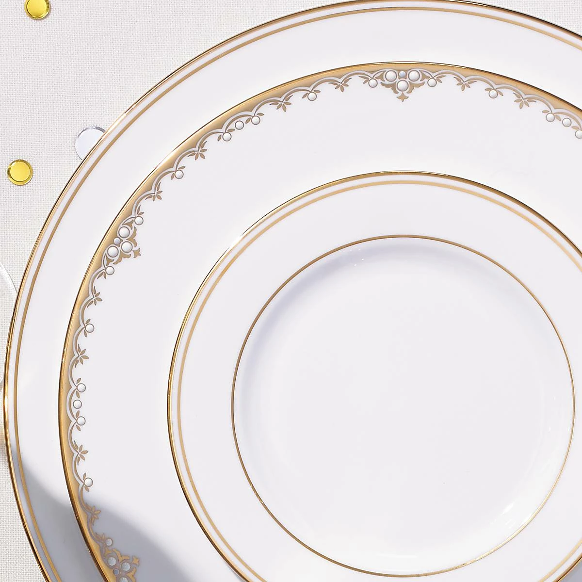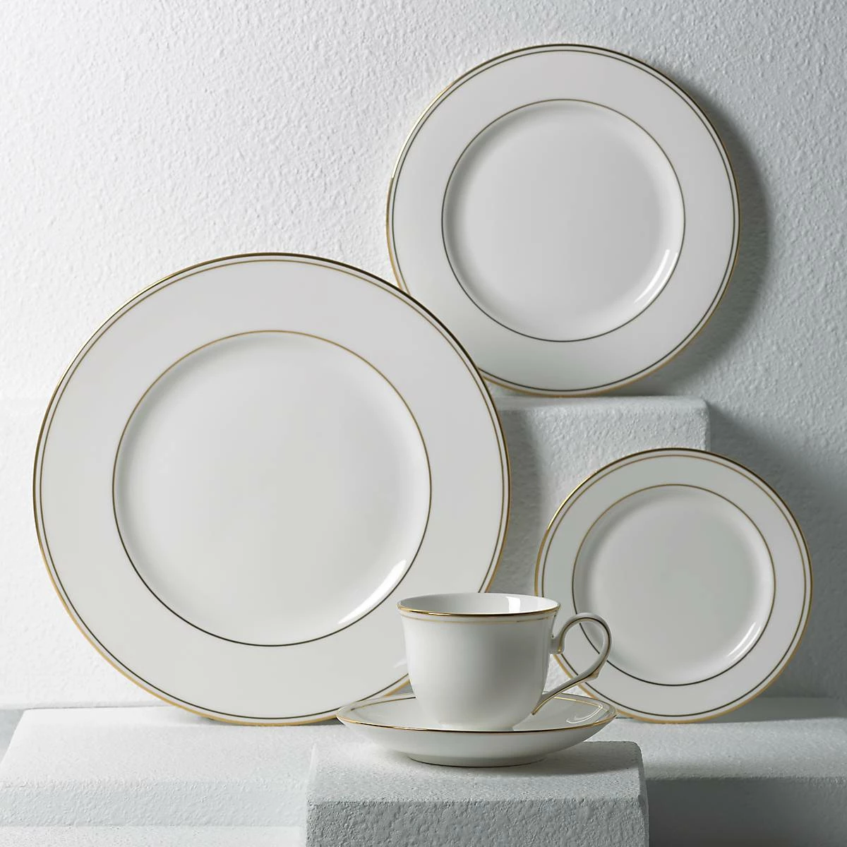 Crafted in durable porcelain and featuring glittering 24-karat gold accents along the rim, this five-piece place setting is a graceful complement to one’s table and includes a dinner plate, salad plate, bread plate and cup and saucer. These items are dishwasher-safe for added convenience