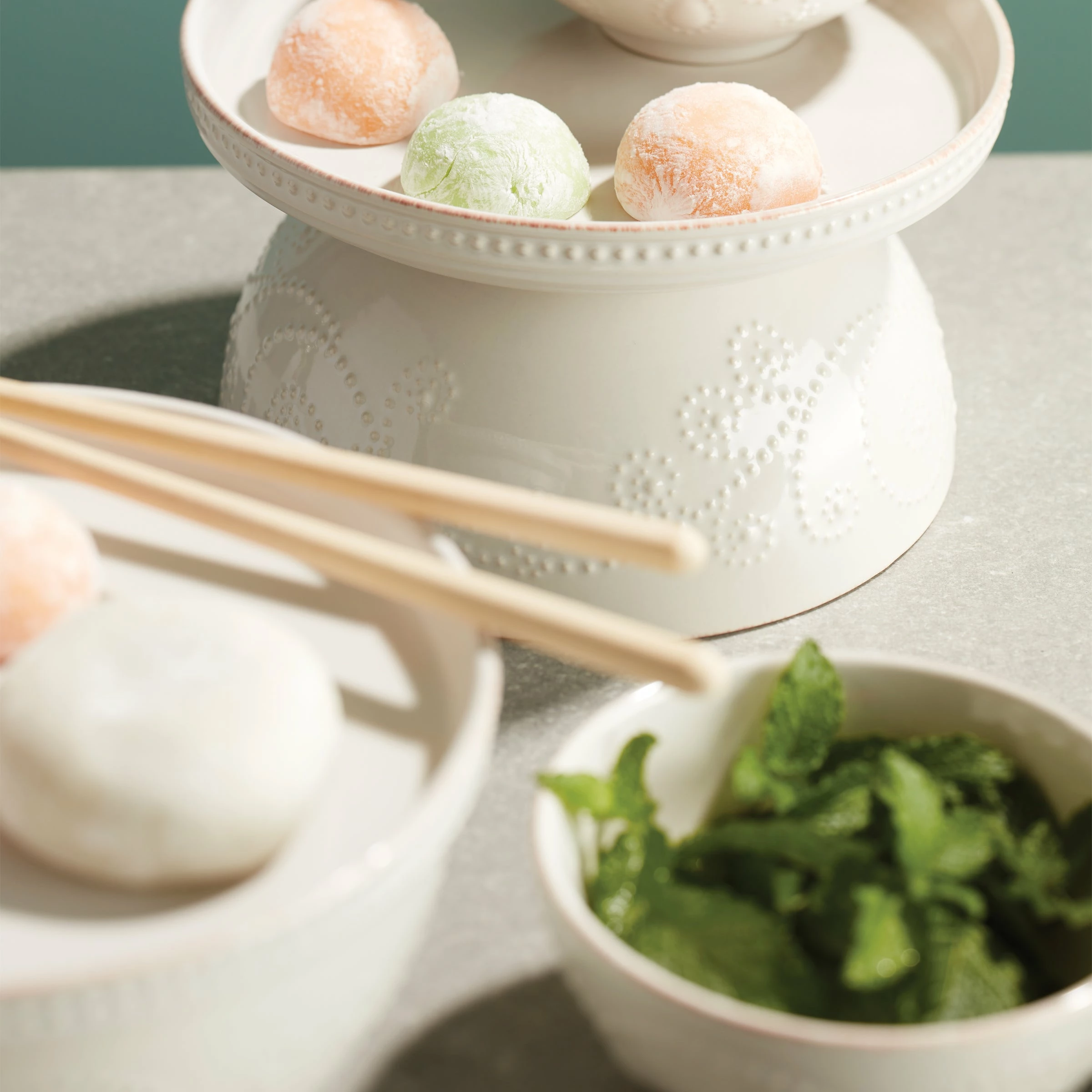 Your favorite Luna nesting dinnerware set now comes in our popular French Perle pattern of raised beads, carved textures, and tea-stain edges. Crafted of stoneware, this stylish space-saver hides six bowls and two plates inside. Take it apart piece by piece to reveal each microwave- and dishwasher-safe component. Put it all back together and it becomes a compact conversation starter for your table!