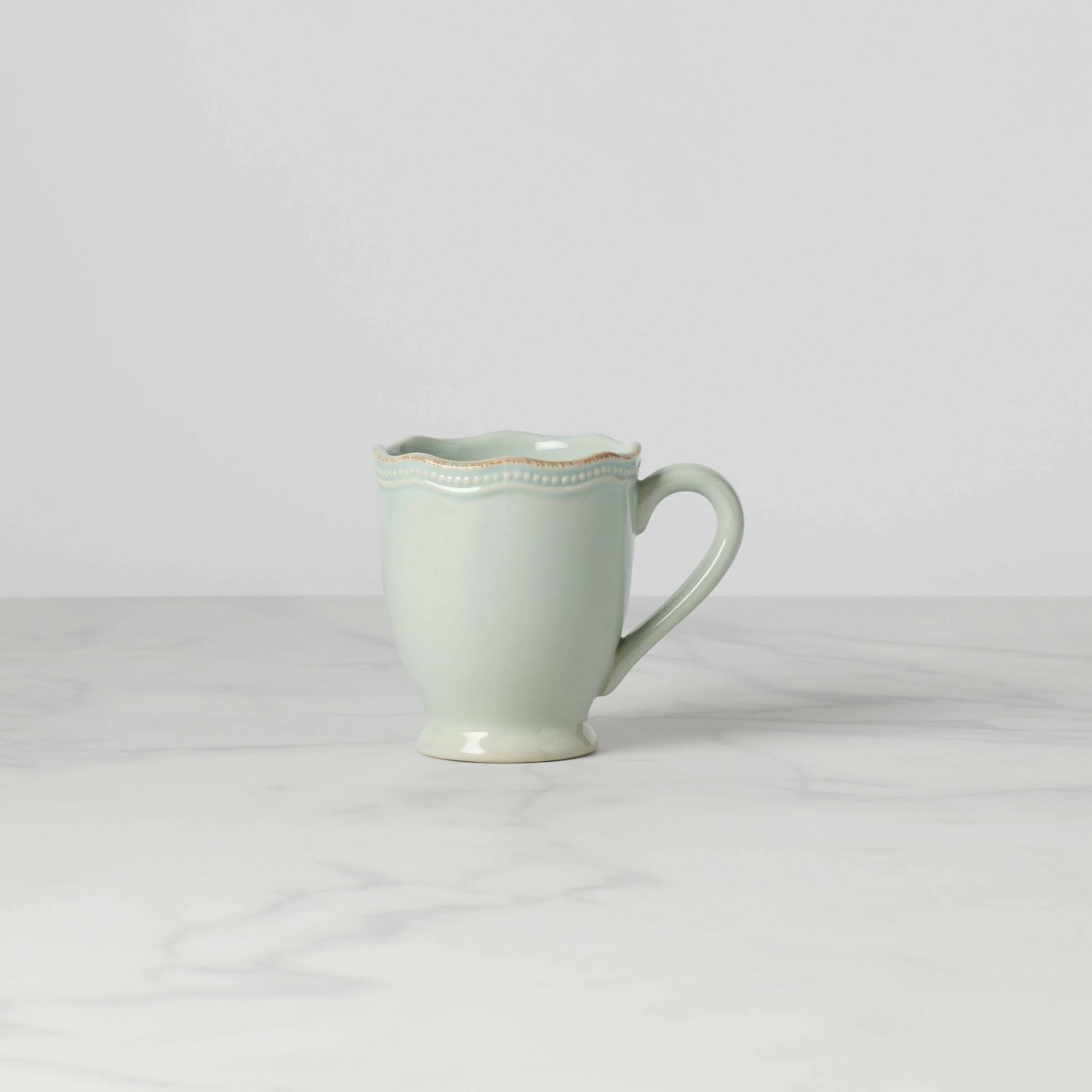 This mug, crafted of durable ceramic stoneware, features a delicate texture with raised dots that call to mind the details of hand-embroidered dresses, and is a soft ice-blue, ideal for the table. This item is microwave and dishwasher-safe, for added convenience.