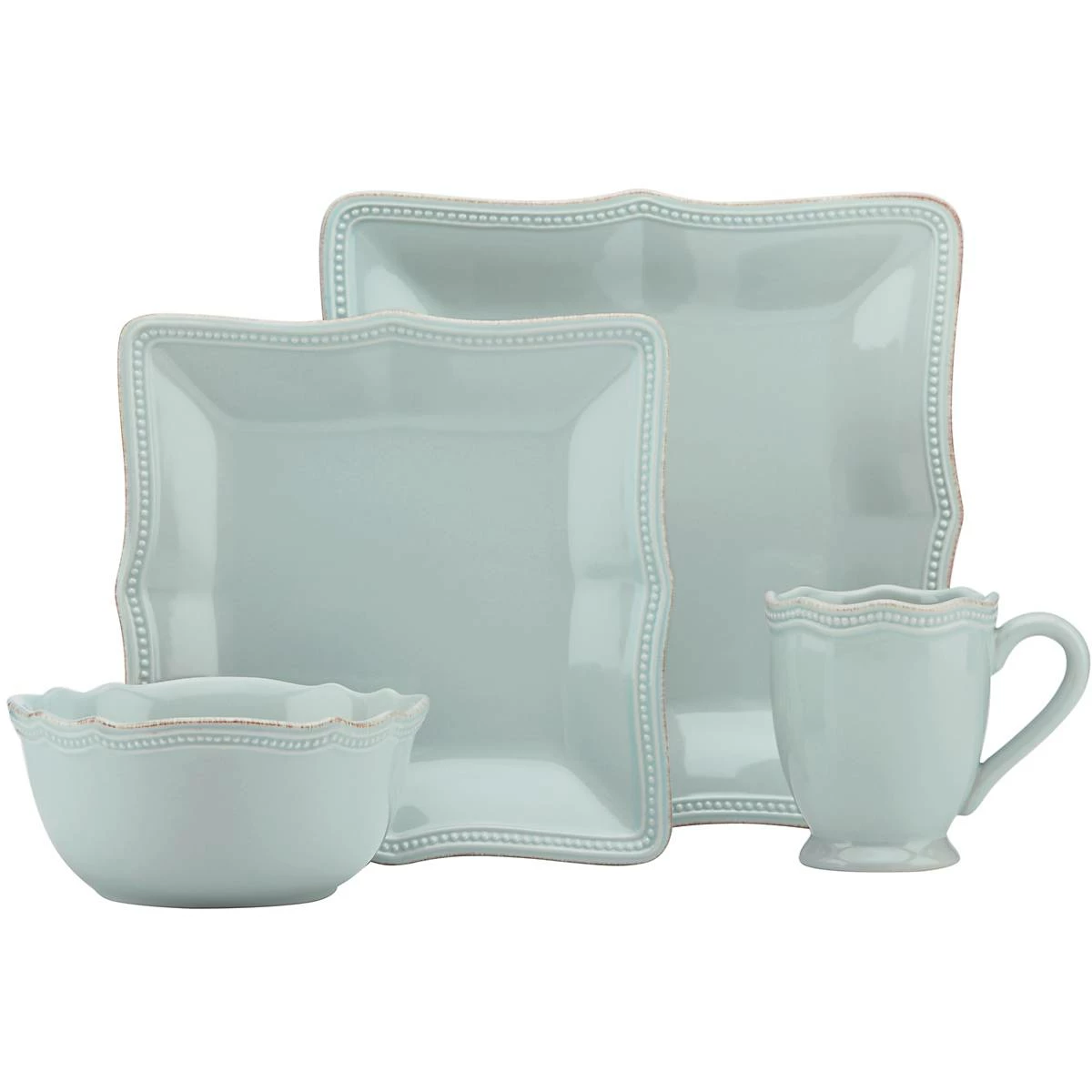 This square-shaped four-piece place setting features a subtle texture with tea-stained raised dots, that provide a gentle contrast to the cool ice blue of the plates, bowl, and mug, for an easy elegance. This durable ceramic stoneware item is microwave and dishwasher-safe, for added convenience.