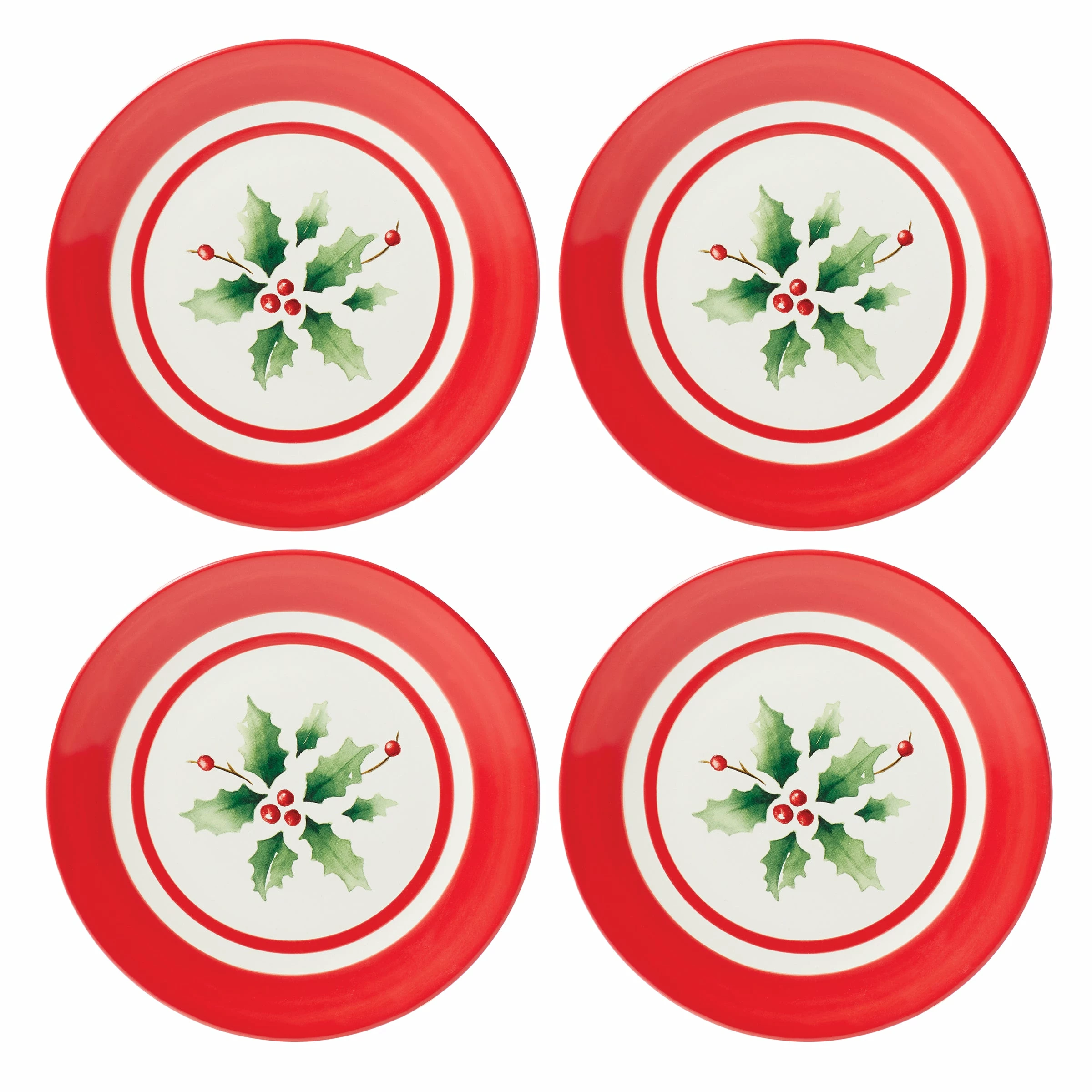 These dessert plates feature a painterly holly leaf design with berries in the center and cheerful red stripes around the rim. This festive set of four is sure to brighten up any holiday table!