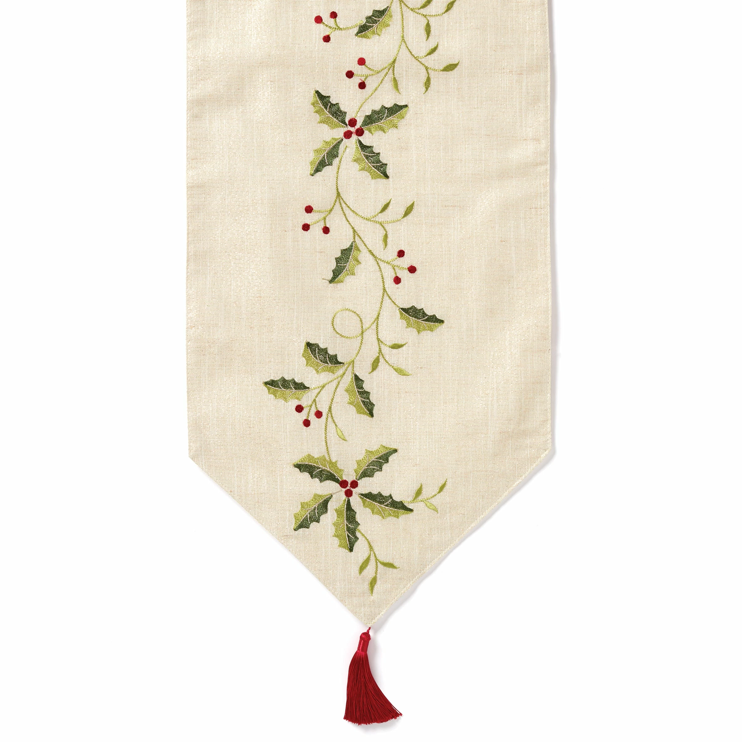 Our legendary Holiday pattern from the 1970s comes to your table in a new way through this elegantly designed table runner that coordinates with your favorite dinnerware line. The creamy white backdrop features a center strip of holly leaves and berries with a red tassel trim at the pointed ends. It’s a stylish addition to your Christmas table setting and a must-have for any Lenox Holiday pattern fans.