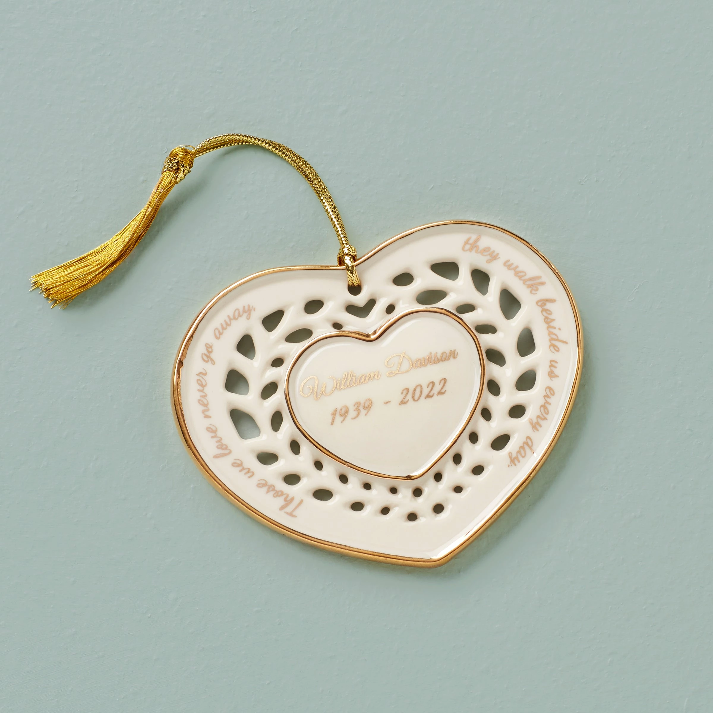 Commemorate those you love forever with this beautiful memorial ornament. Crafted of porcelain and featuring 24-karat gold accents, this heart-shaped ornament can be personalized with any name and date for a keepsake you will treasure in their memory.