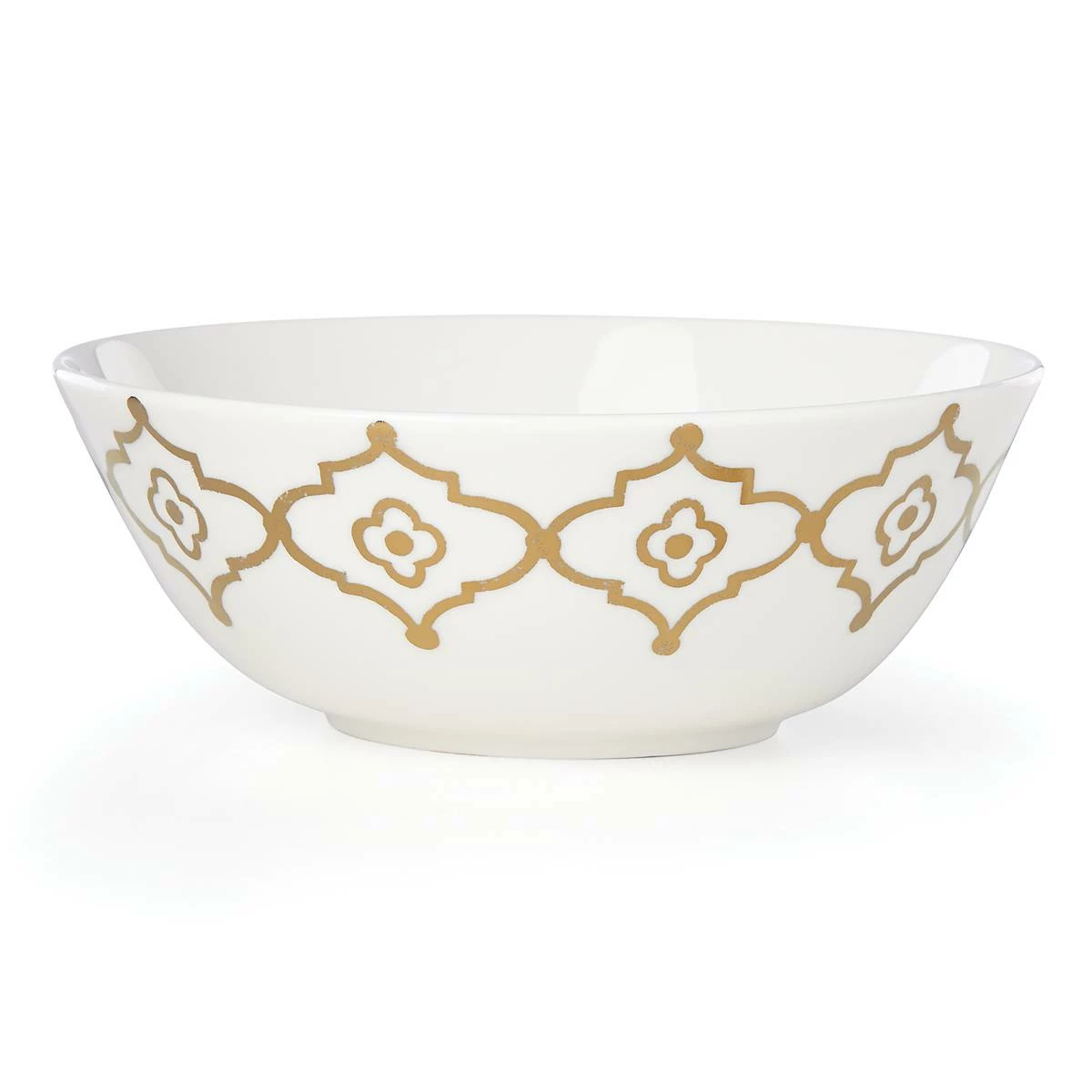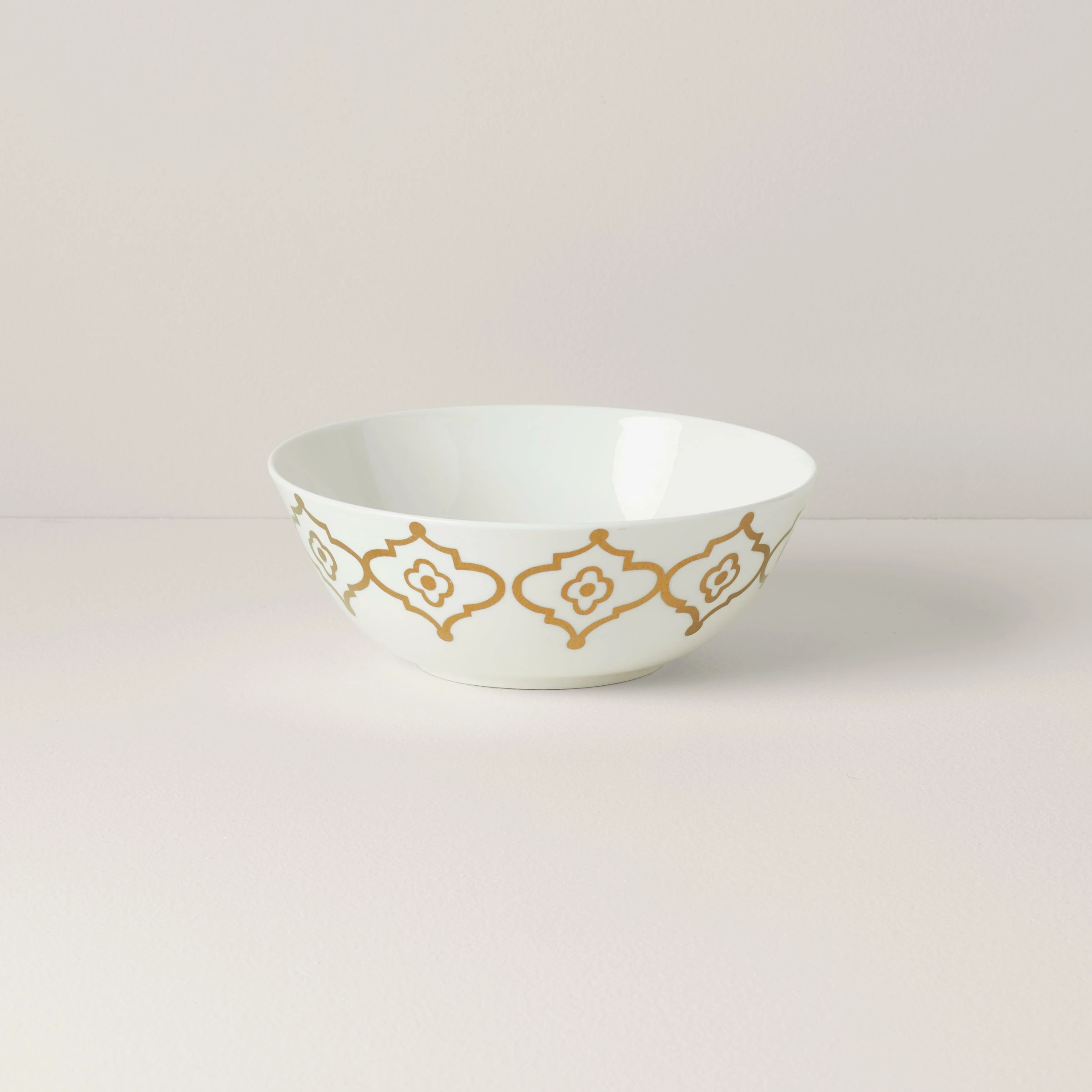 The pristine white surface of the Mosaic Radiance Medium Serving Bowl features exotic geometric patterns and rims in microwave-safe gold. Featuring a gleaming glossy finish, this robust and durable bone china bowl is microwave and dishwasher-safe. Available exclusively at Bloomingdale’s and Lenox.com.