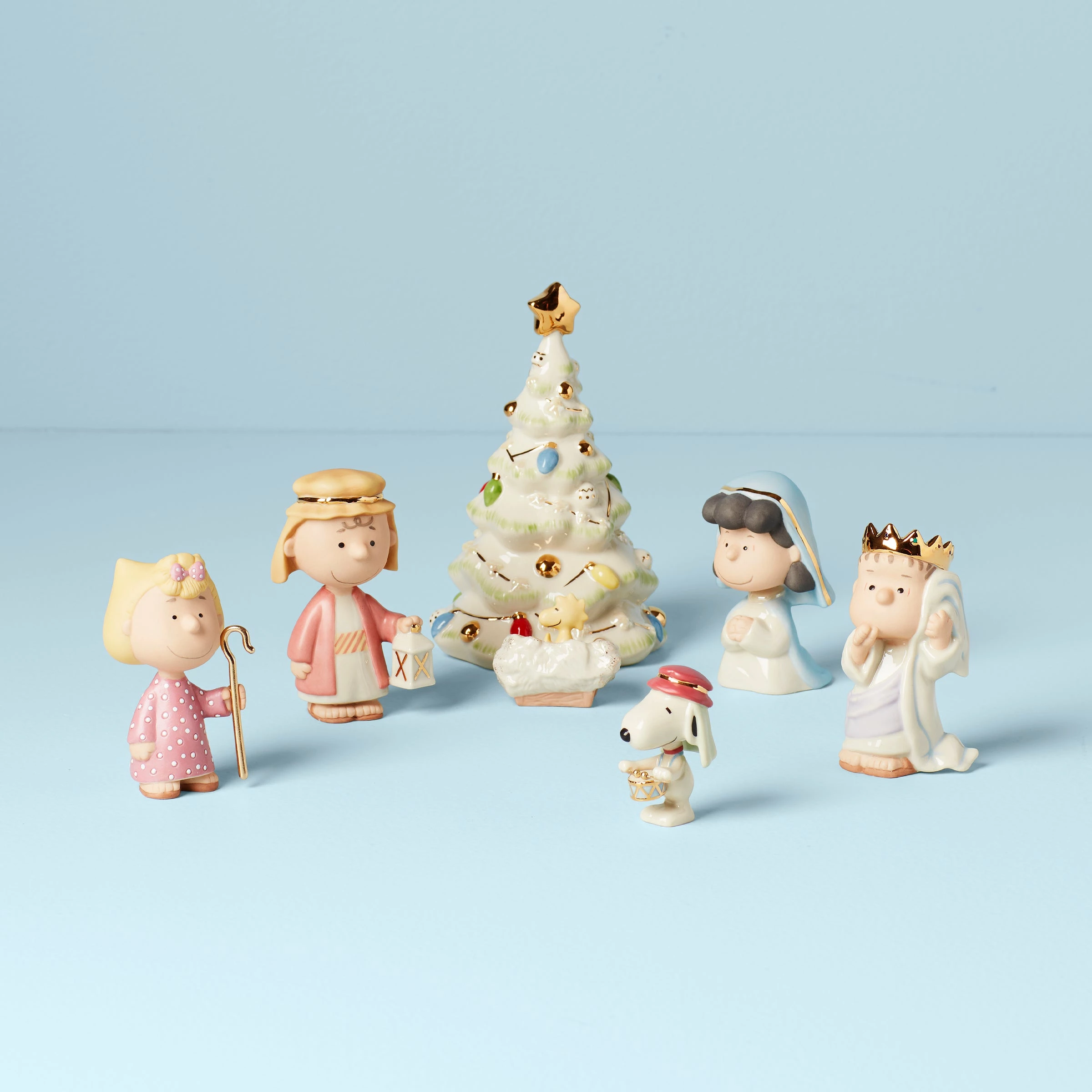 The Peanuts gang is all here in this charming nativity scene figurine set crafted of hand-painted ivory porcelain with luminous 24-karat gold accents.
