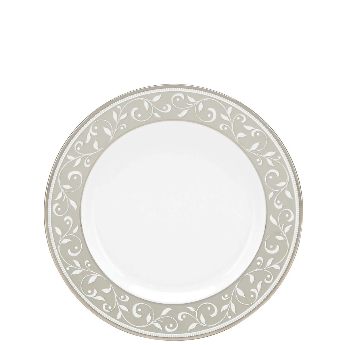 Ideal for use as a bread plate, the lavish and tranquil Opal Innocence Dune Bread Plate features a soft taupe frame and a delicate, scrolling dot motif of vines and leaves. This ornatescrolling dots and is accented in precious platinum, and is dishwasher-safe for added convenience.