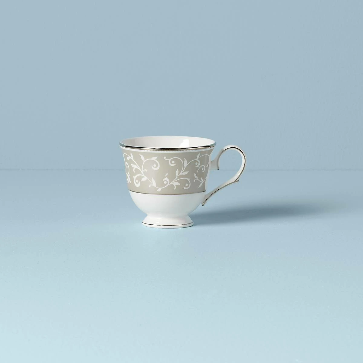Ideal for an elegant and lavish tea time, the ornate and sophisticated Opal Innocence Dune Teacup features a scrolling dot motif of leaves and vines. This pristine white and pale taupe durable bone china tea cup is dishwasher-safe, and is accented in precious platinum.