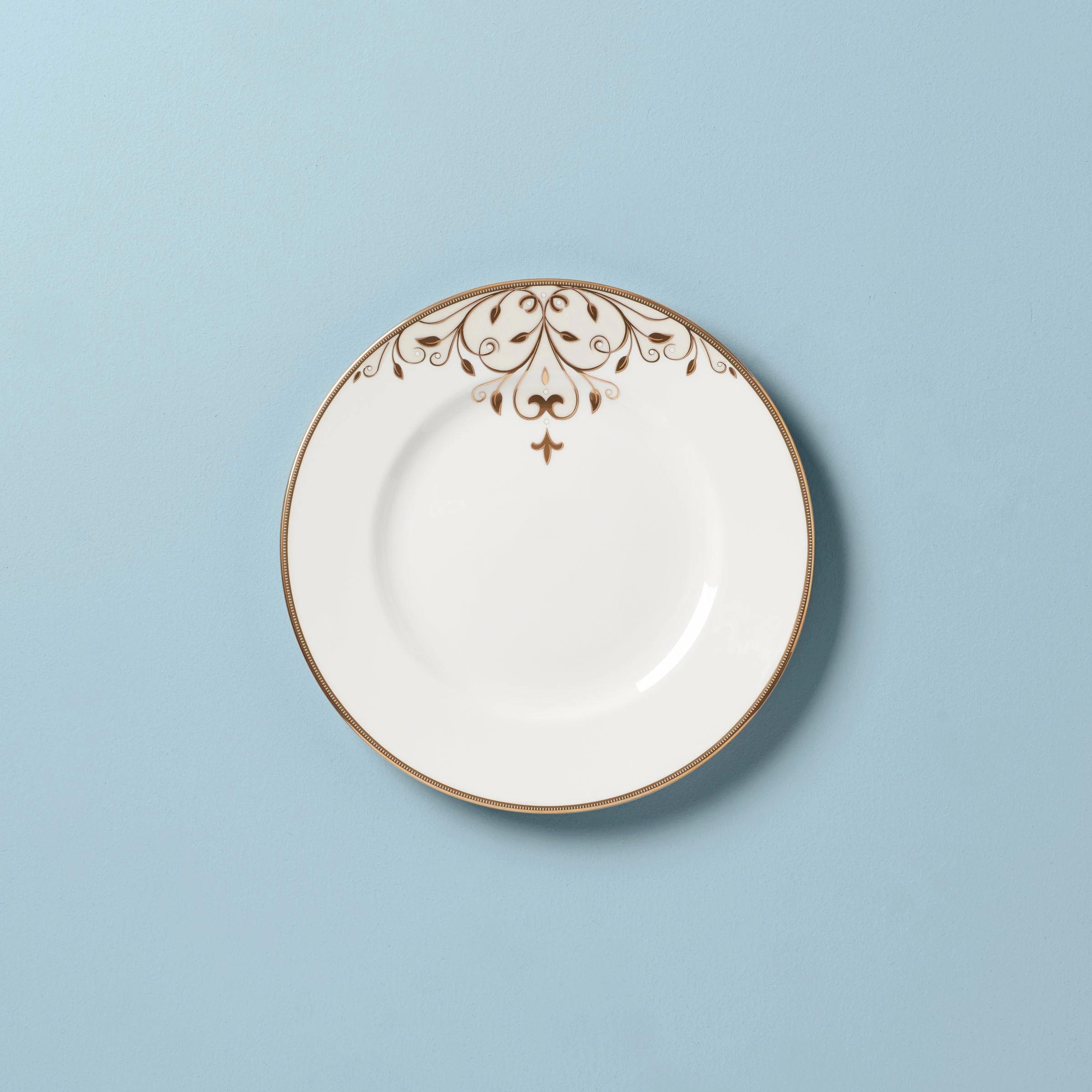The ornate and stylish Opal Innocence Scroll Gold Dinner Plate features a shimmering white mica scroll motif. This elegant and durable bone china plate is accented in precious 24-karat gold, and is dishwasher-safe for added convenience.