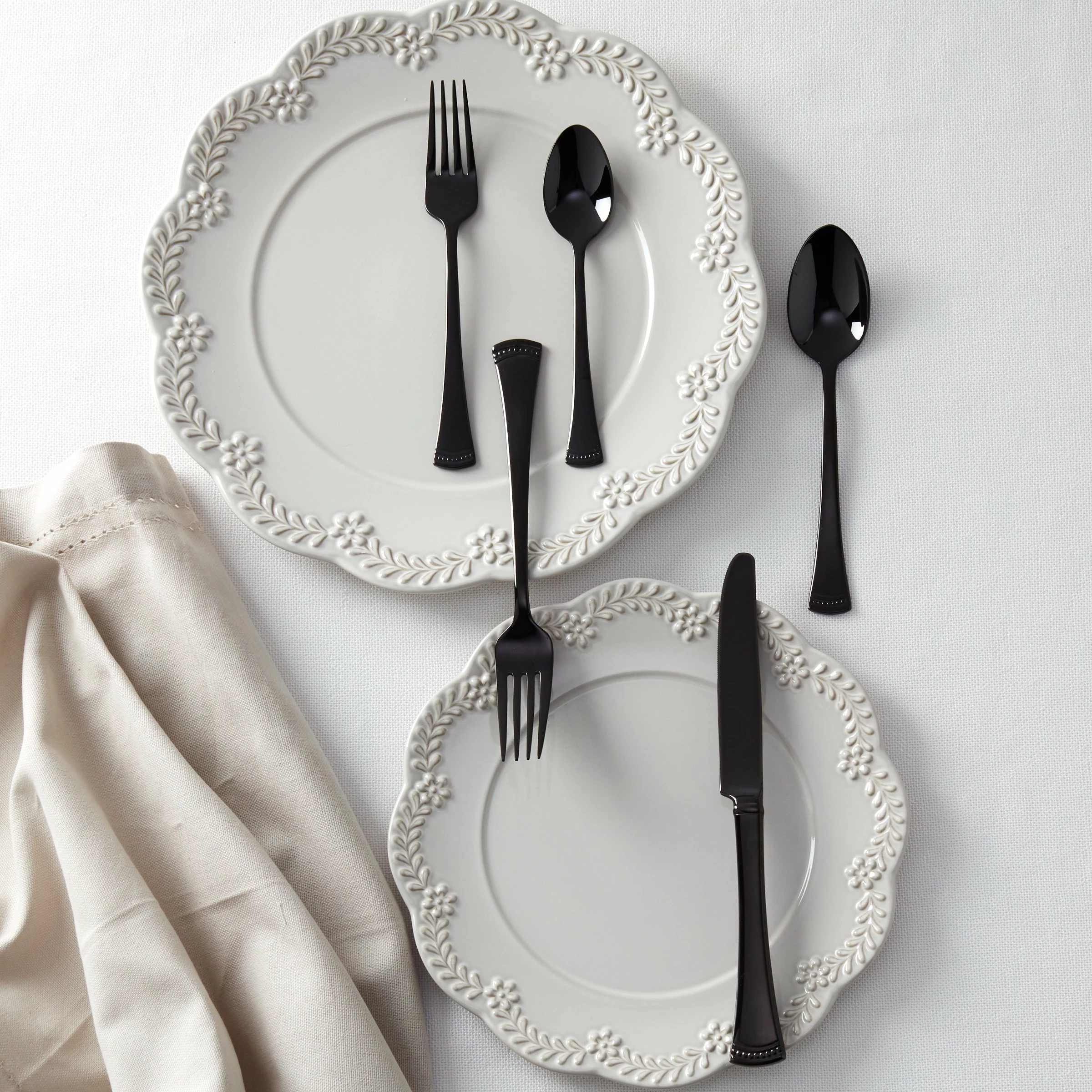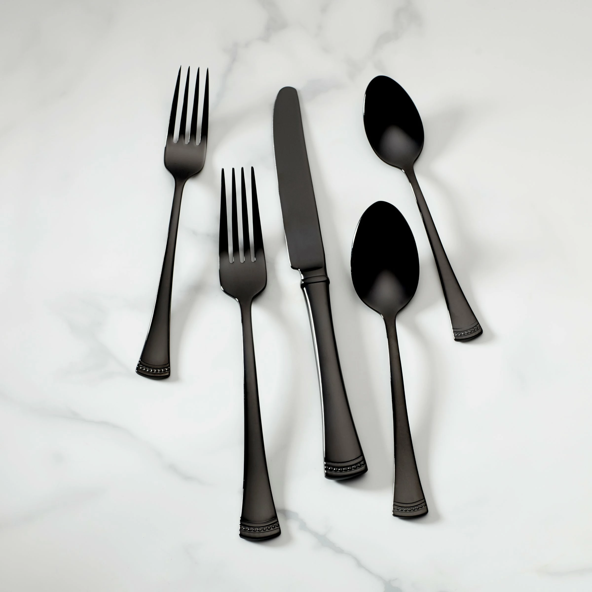 The same classic Portola flatware that you know and love, now in a black color with a mirror finish. Complete with flared handles and a beaded channel at each base, this set includes forks, salad forks, knives, spoons and teaspoons that’s perfect for serving four people.