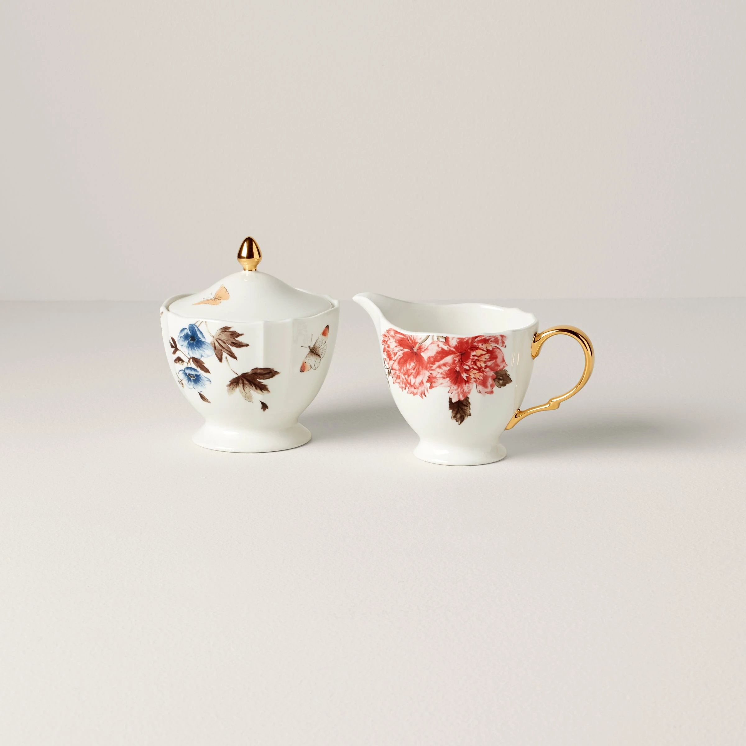 Bring the beauty and bright colors of a lush English garden to your home with the Sprig & Vine collection. This sugar bowl and creamer set features botanical illustrations inspired by vintage textiles. The golden handle on the creamer is the perfect touch to give this set a gleaming finish.