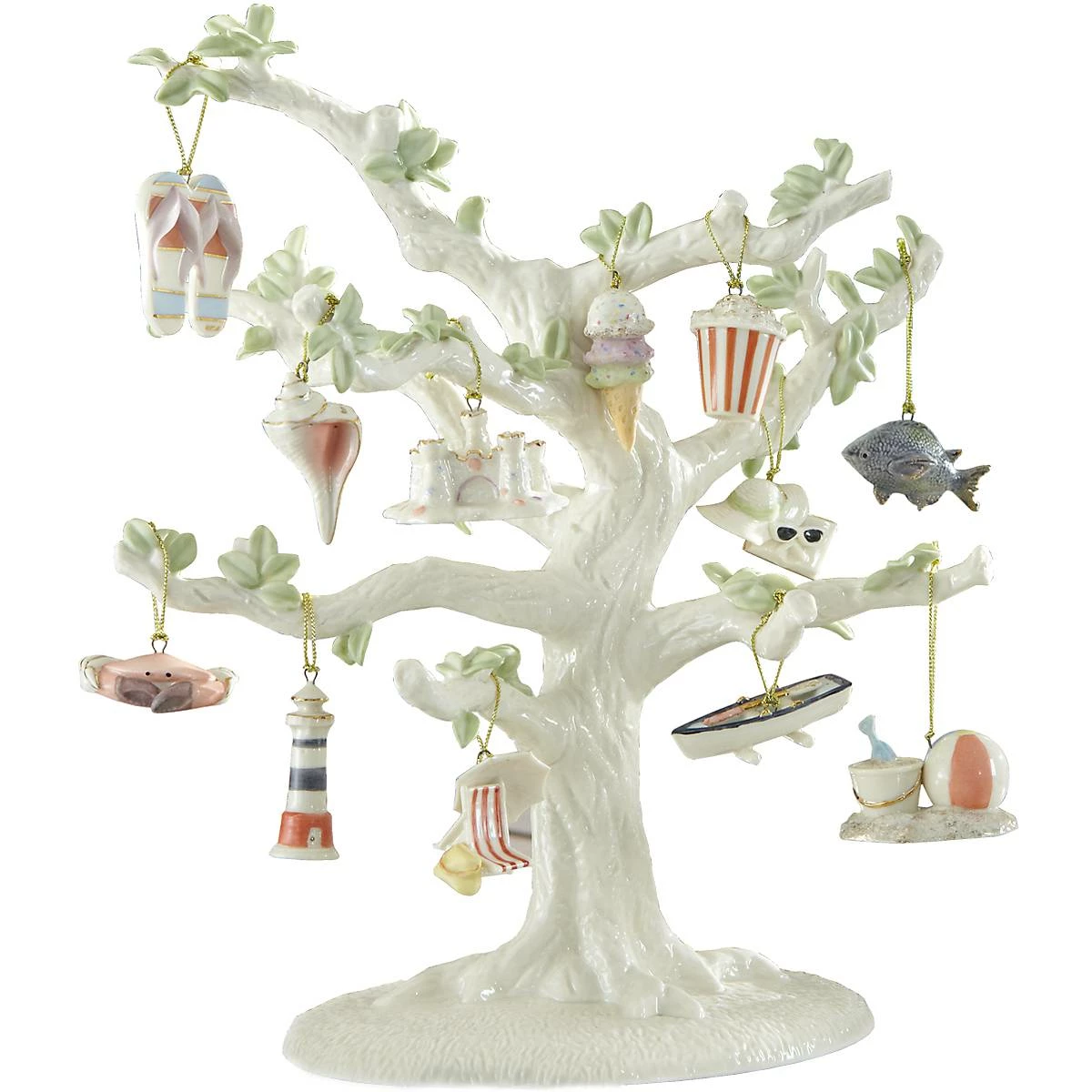 Celebrate summer, even in wintertime, with this white ceramic tree and 13-piece ornament set, featuring a variety of symbols of the warmest time of year, from an ice cream cone to a fun pair of flip-flops that look ready for the beach.