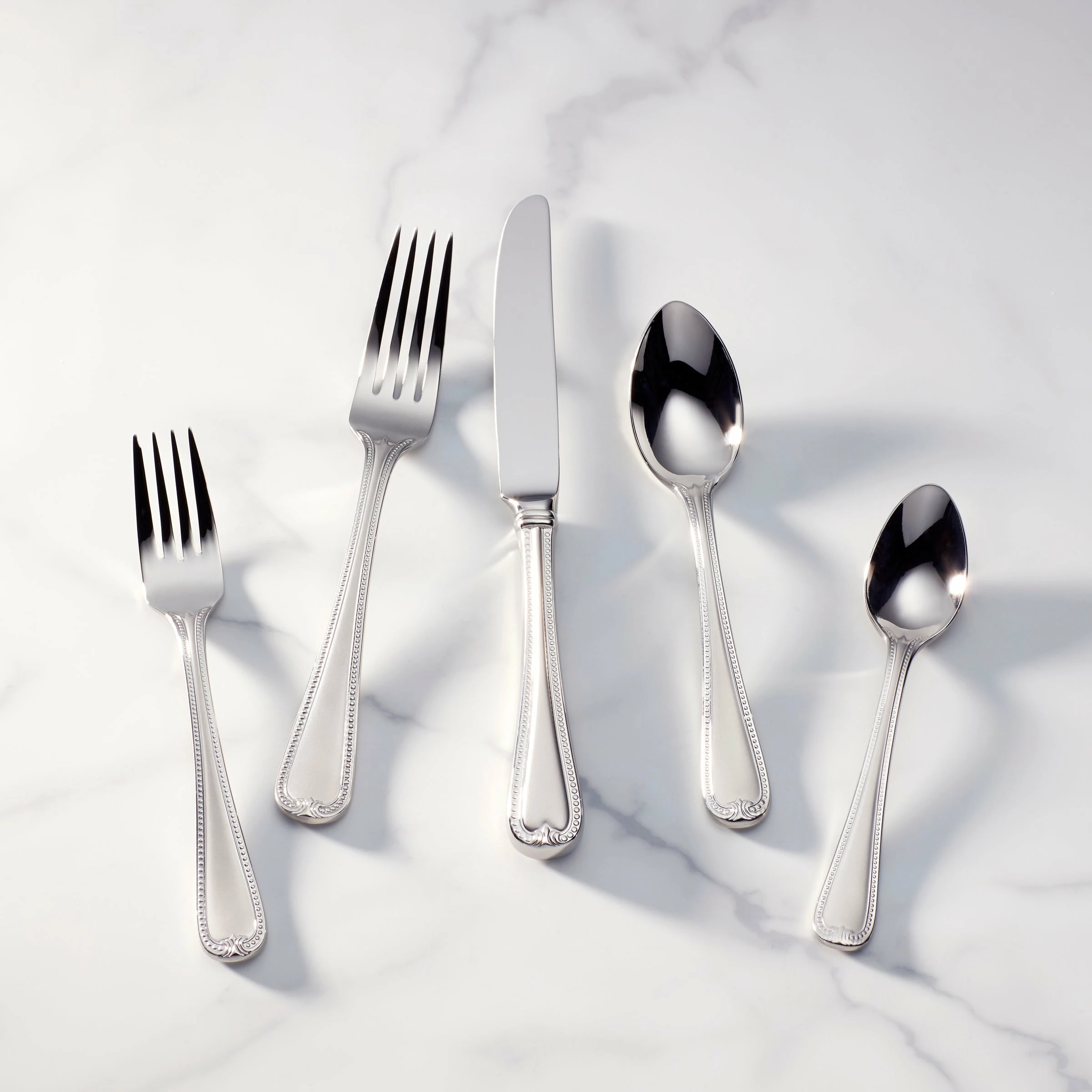 Casual and stylish, the Vintage Jewel Frosted 5-piece Place Setting is crafted from durable 18/10 stainless steel with an elegant frosted finish. This set is dishwasher-safe, and includes a dinner fork, dinner knife, salad fork, tablespoon, and teaspoon.