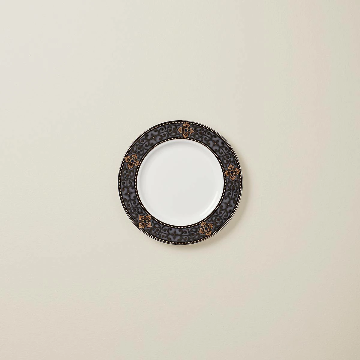 This Vintage Jewel salad plate, made of durable white bone china, features an ornate black-and-gold pattern of scrollwork along its border, as well as accents of 24-karat gold and precious platinum. The enamel dots gives the piece a fine texture. This item is dishwasher-safe, for added convenience.