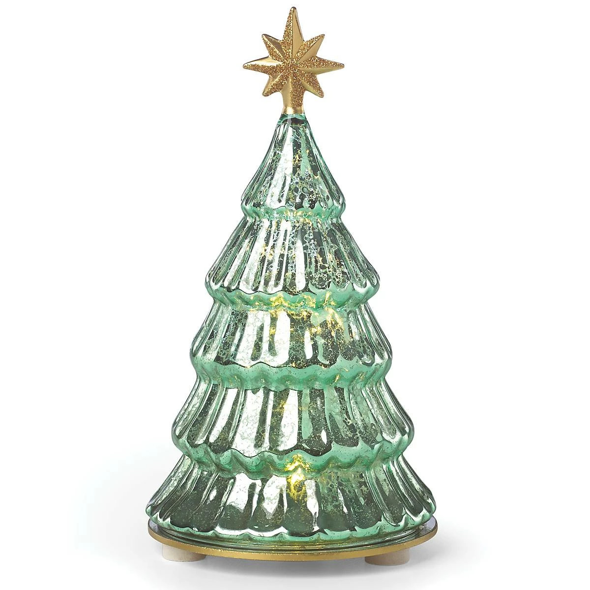 This lit mercury tree figurine adds a soft glow when it lights up, adding whimsy. A golden star gleams from on top of this tree of pine.
